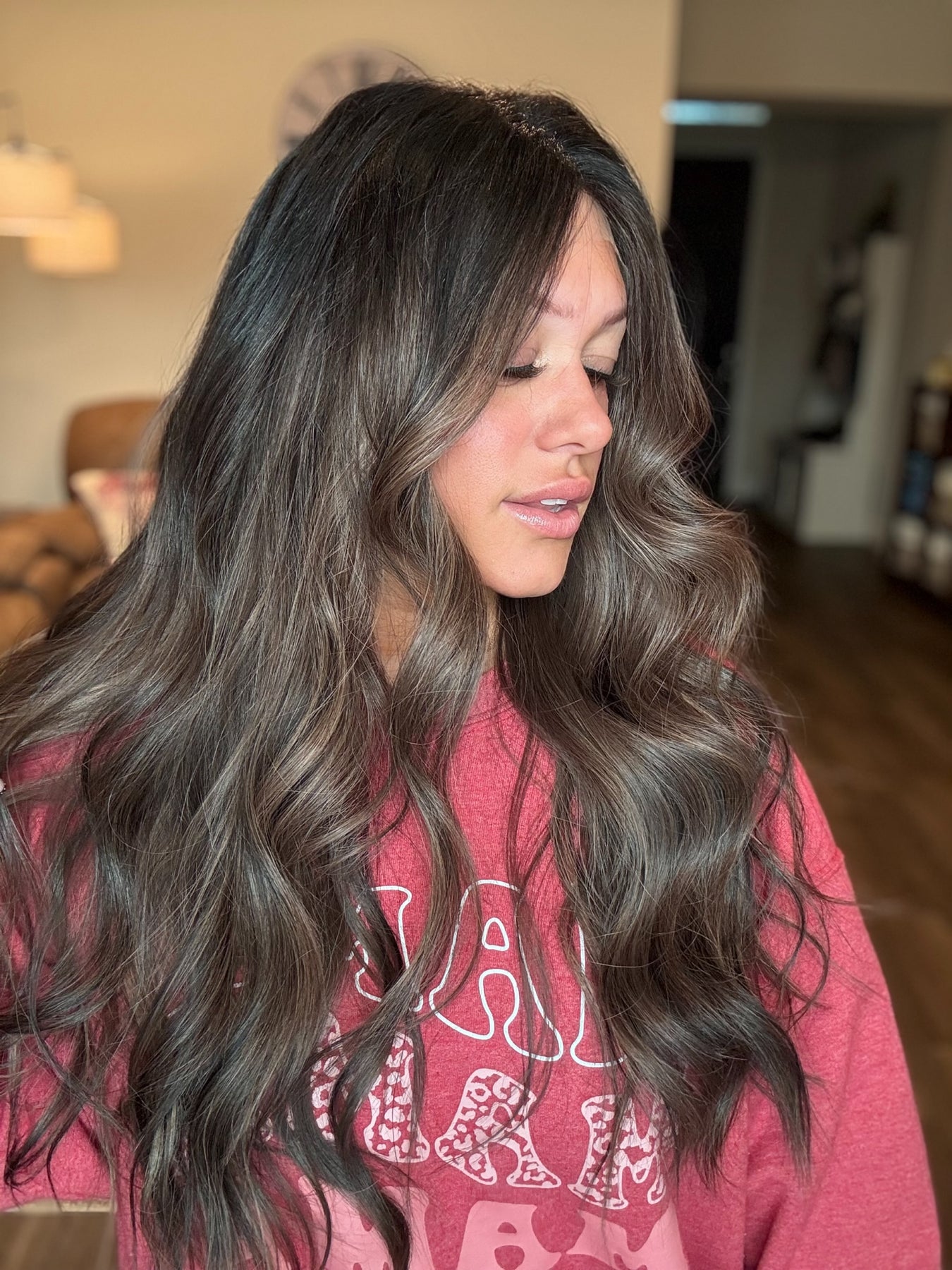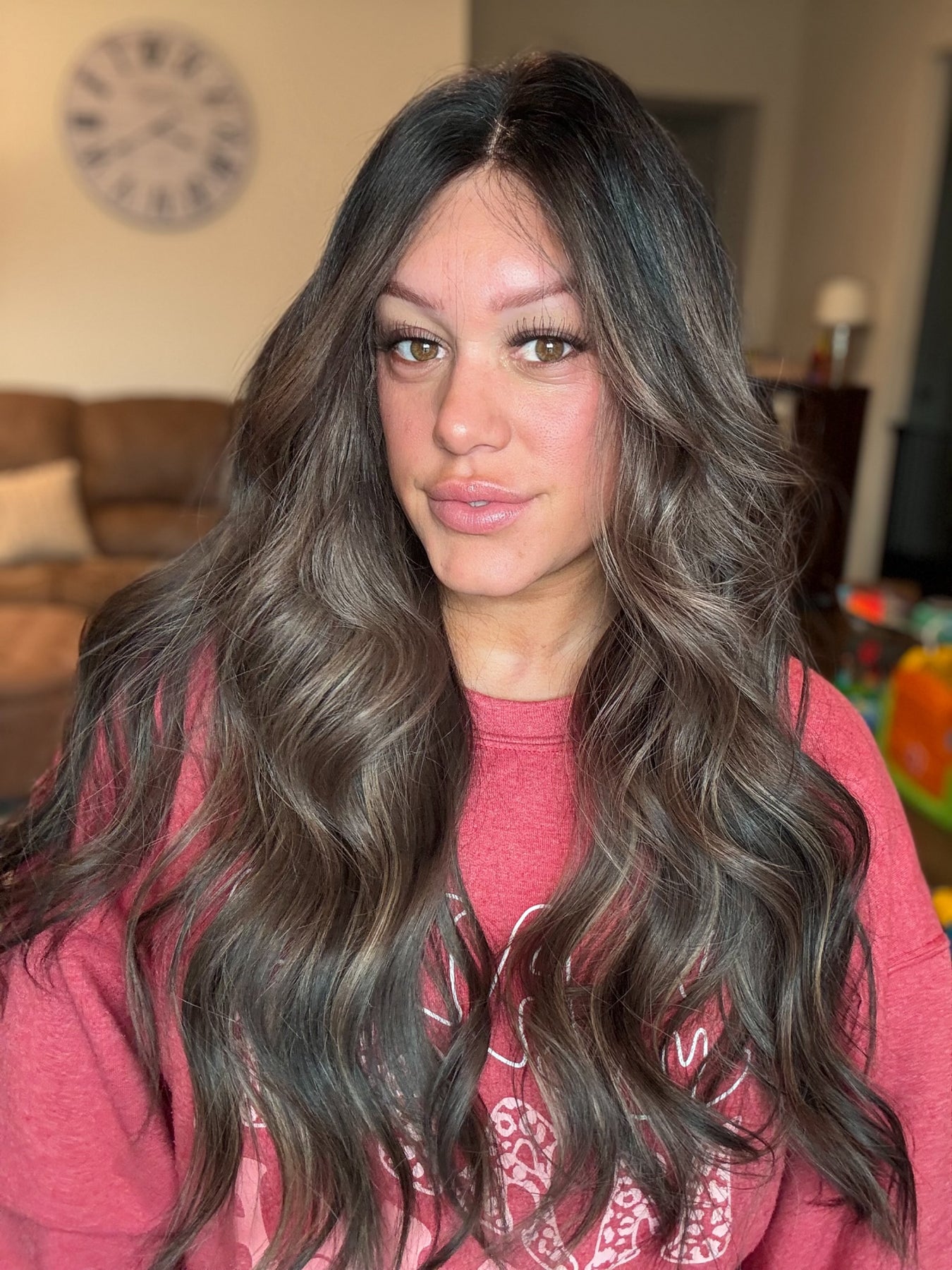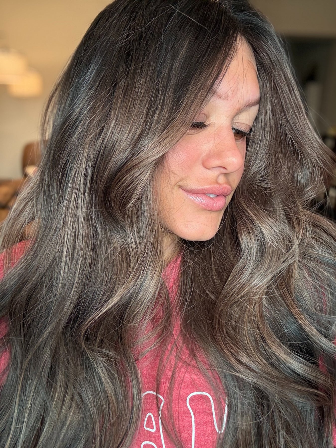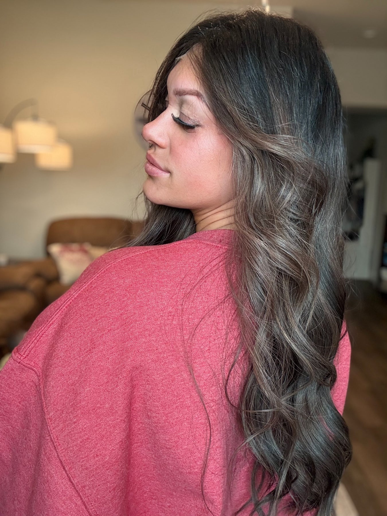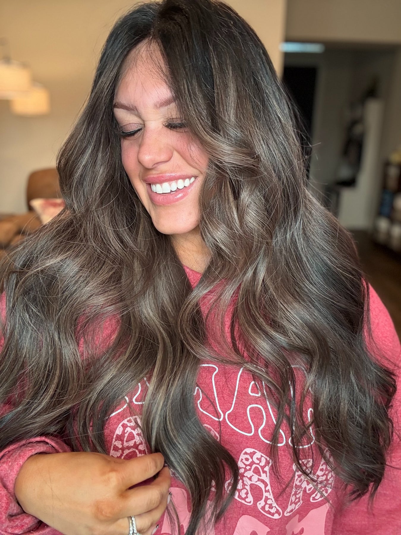 Color: an espresso brown base fading into a Mouse brown balayage with bright chestnut highlights throughout