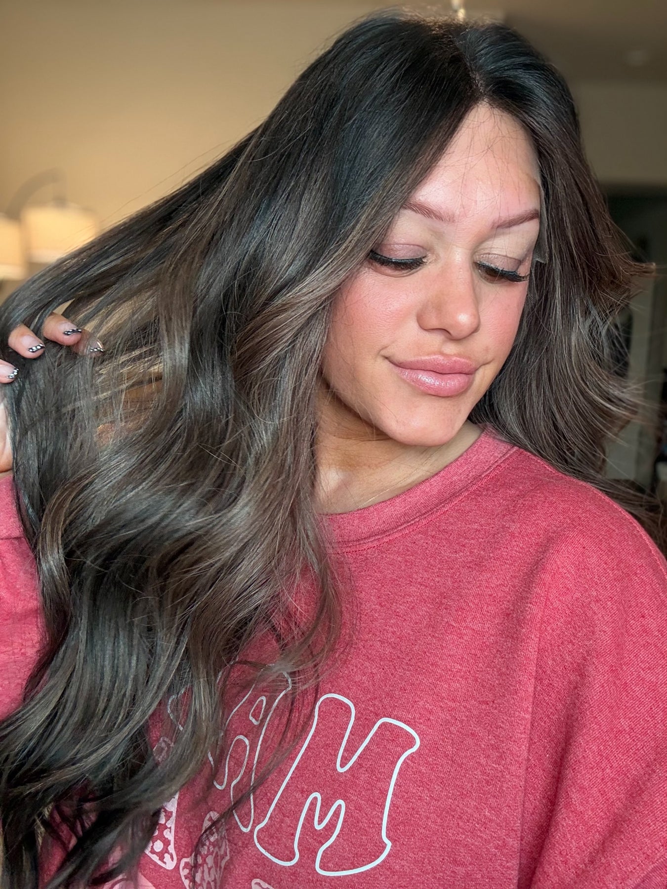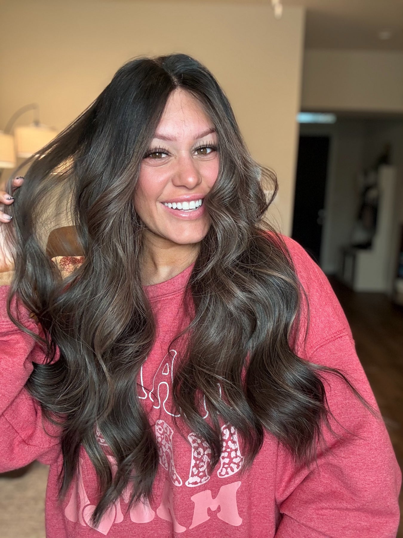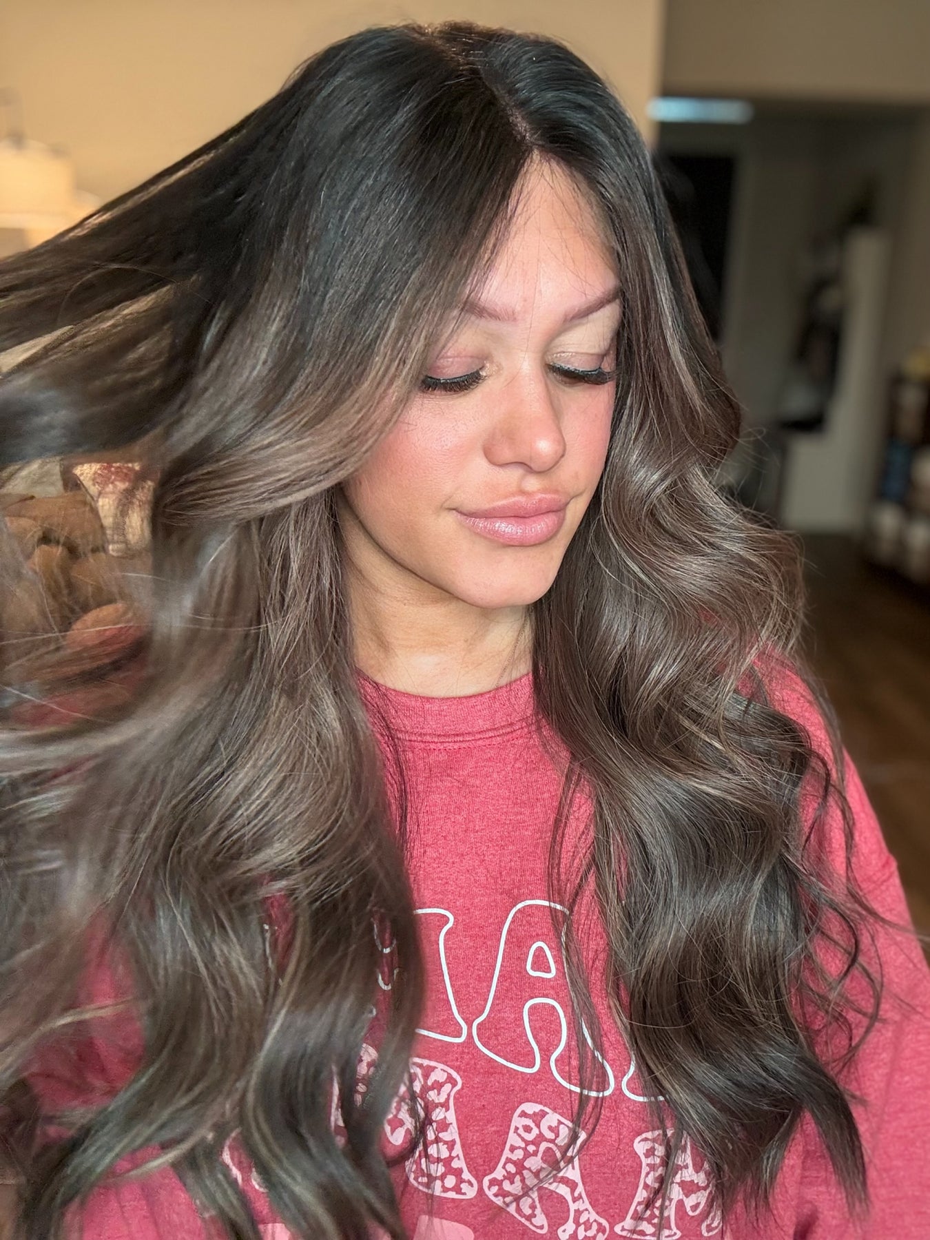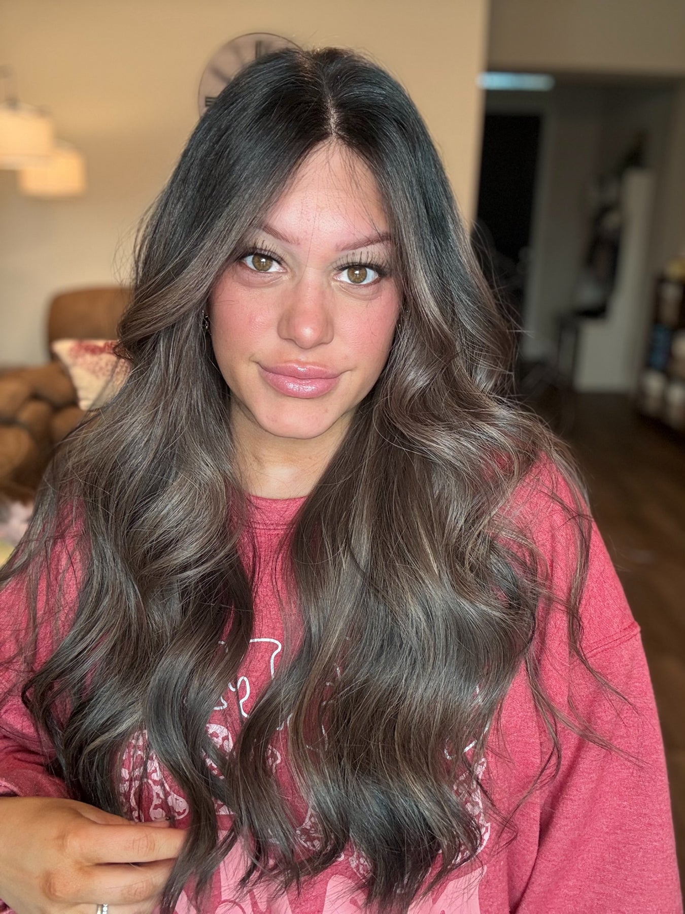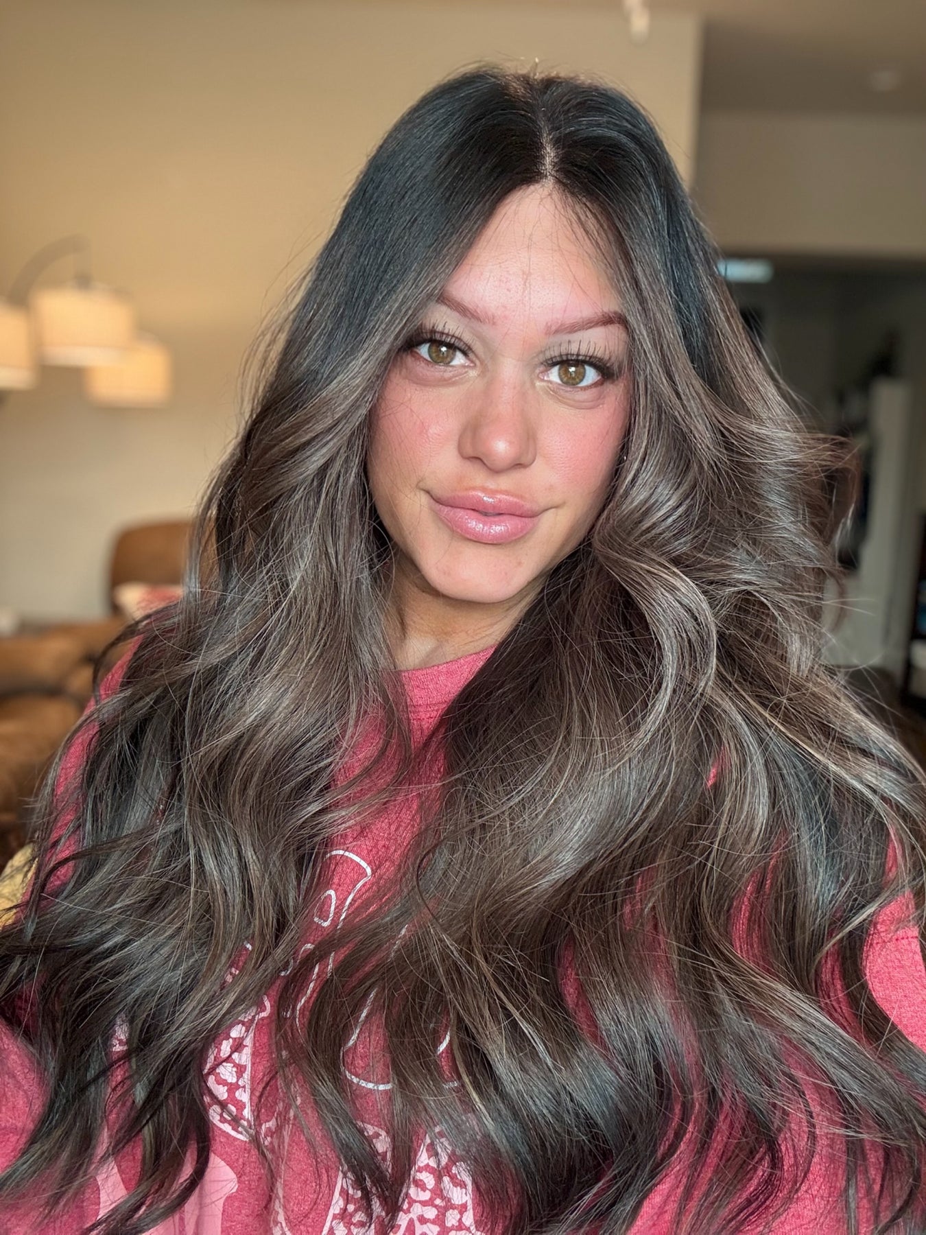 Color: an espresso brown base fading into a Mouse brown balayage with bright chestnut highlights throughout