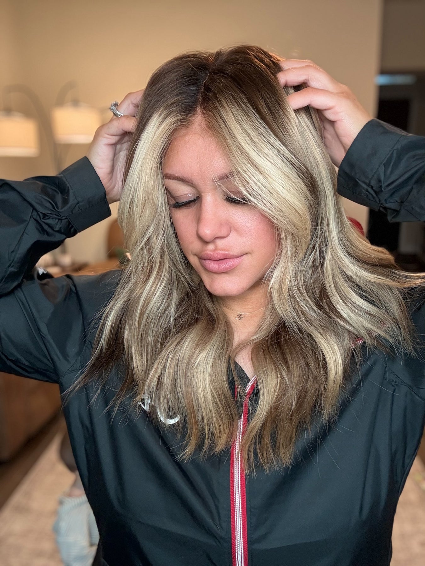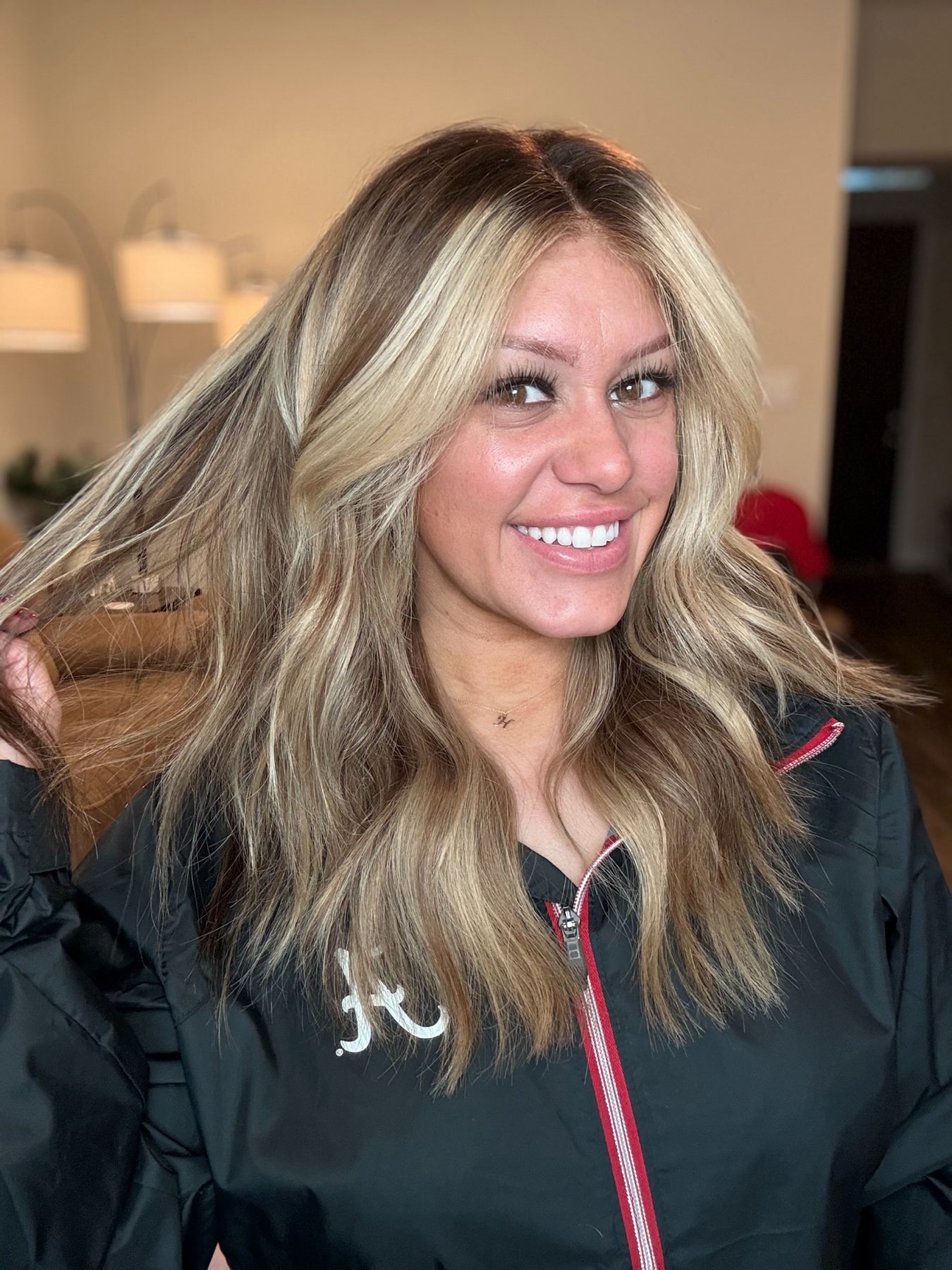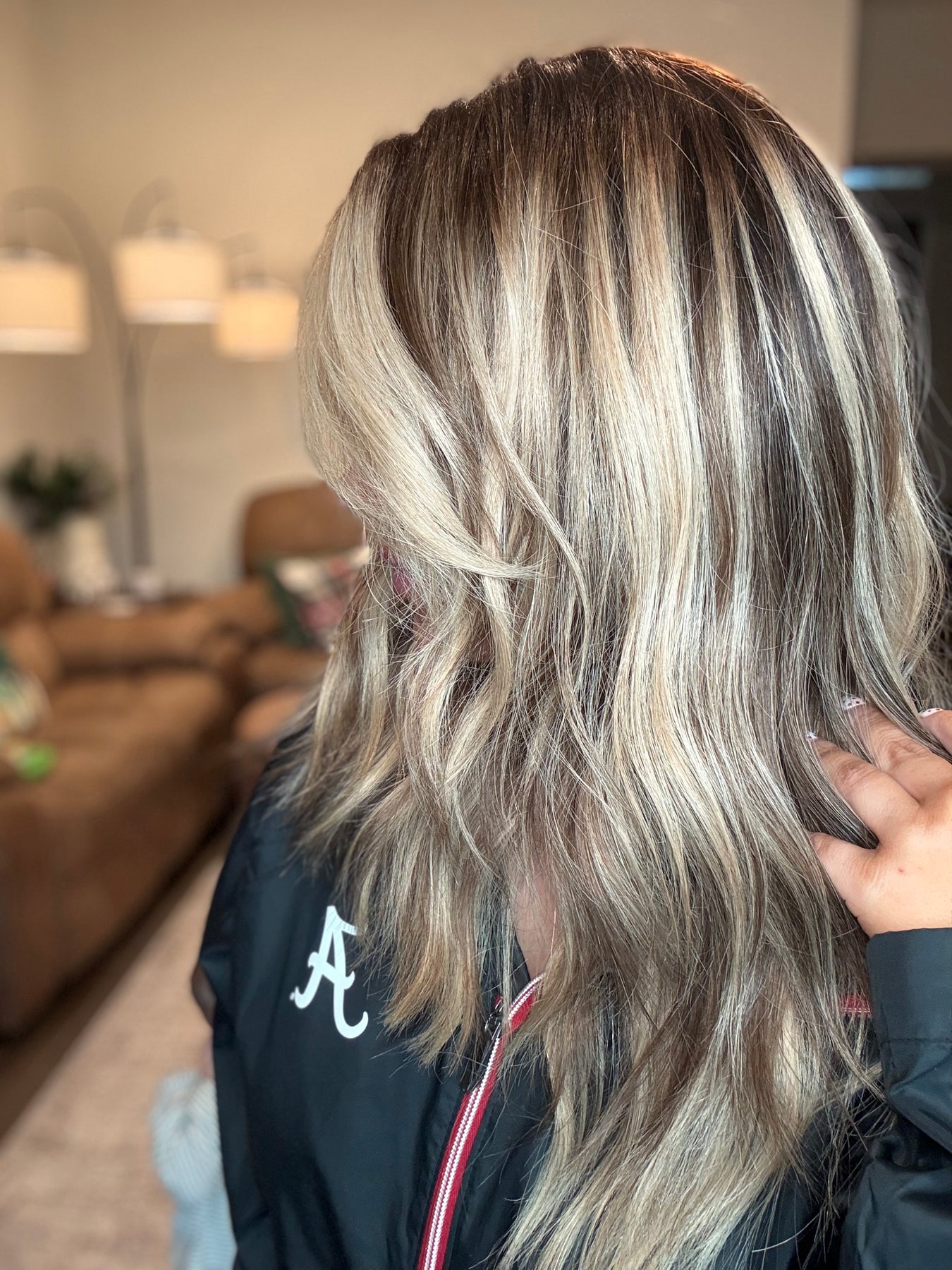 color: A dark rich, chocolate, brown base Fading into a creamy blonde balayage with sand blonde lowlights and beige blonde highlights throughout
