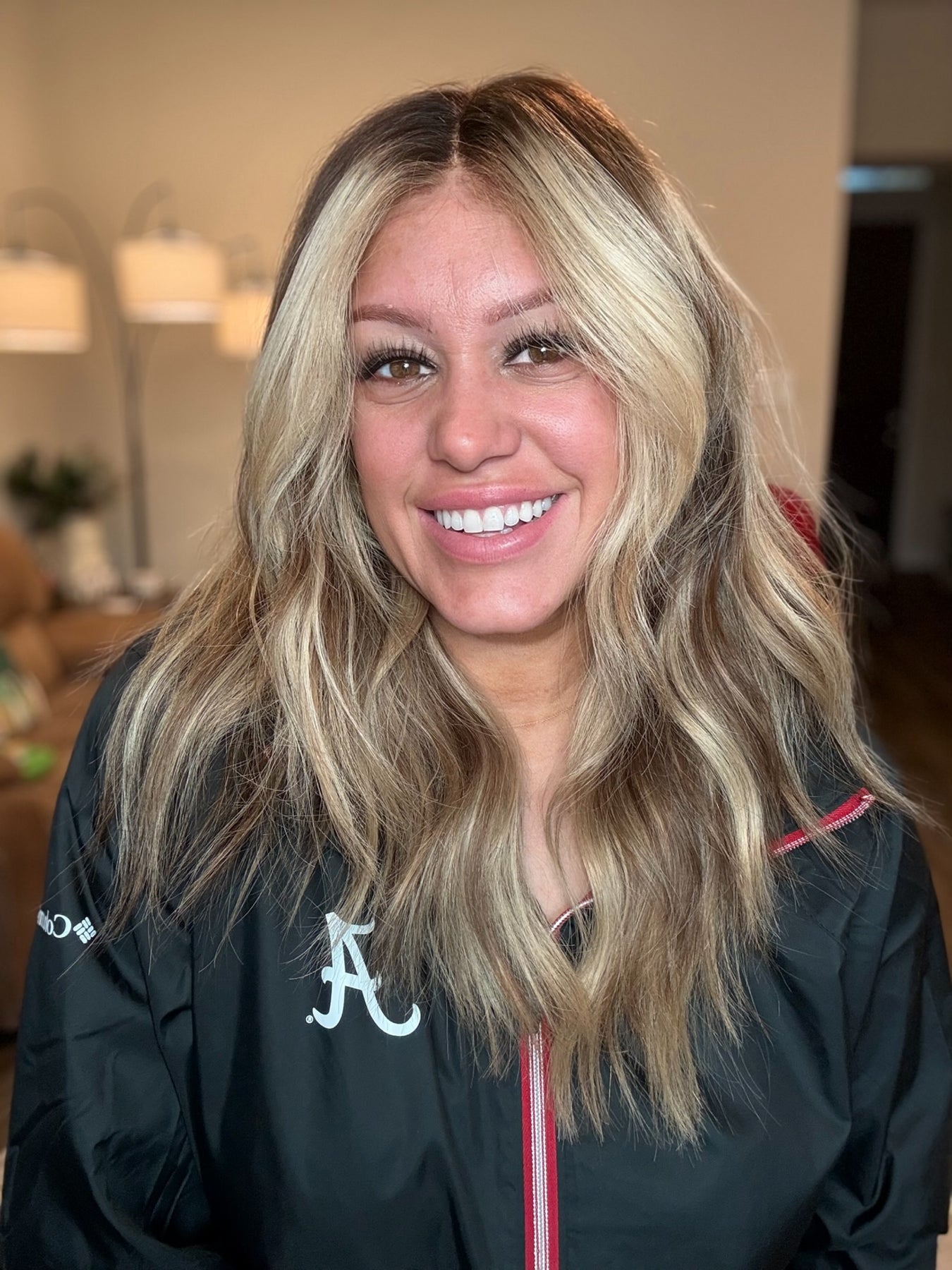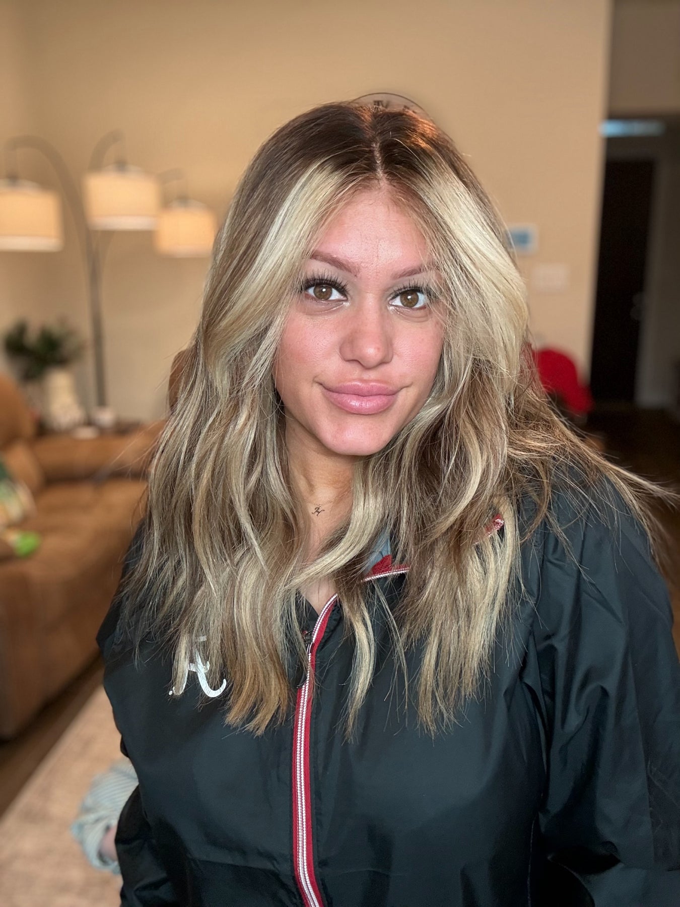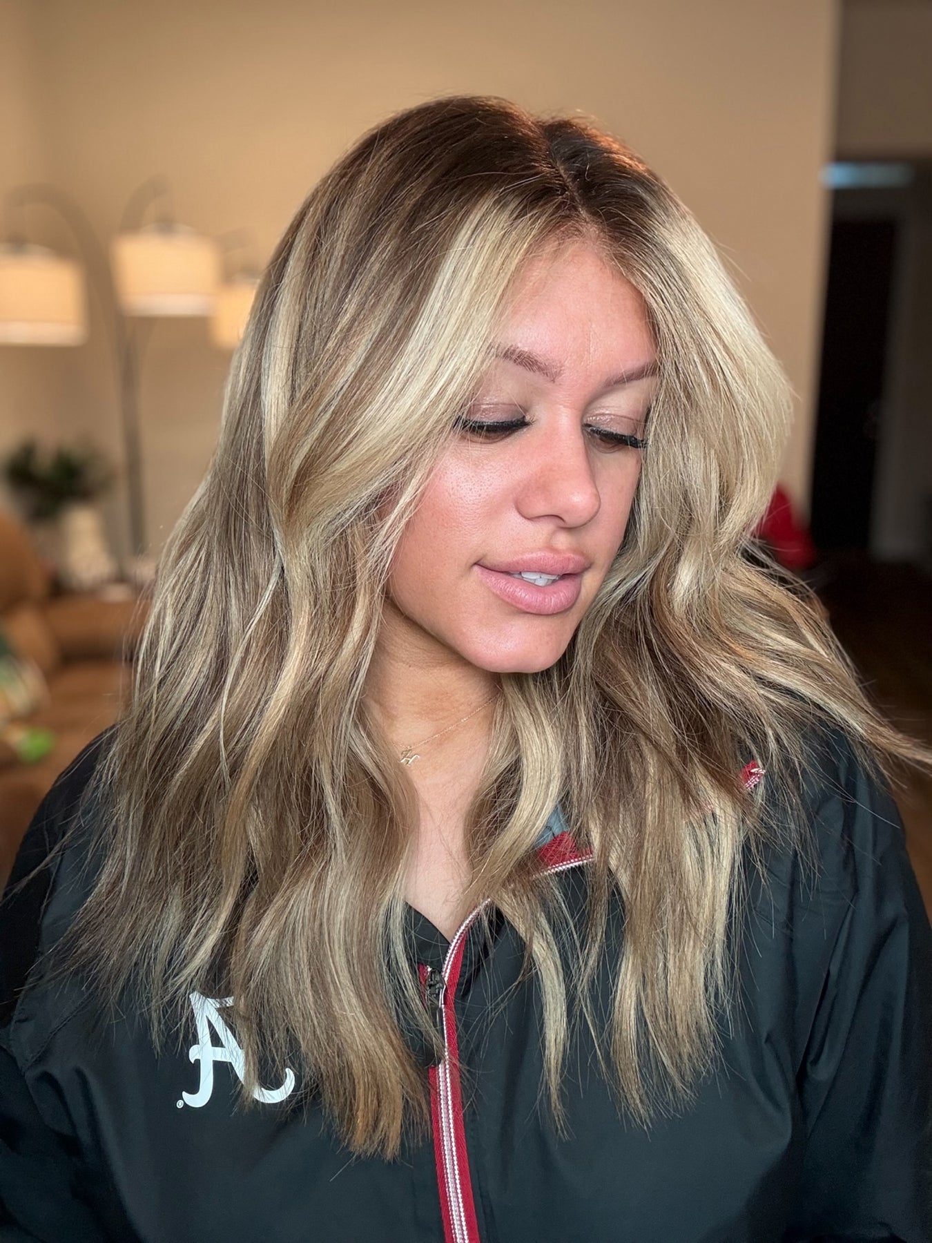 color: A dark rich, chocolate, brown base Fading into a creamy blonde balayage with sand blonde lowlights and beige blonde highlights throughout