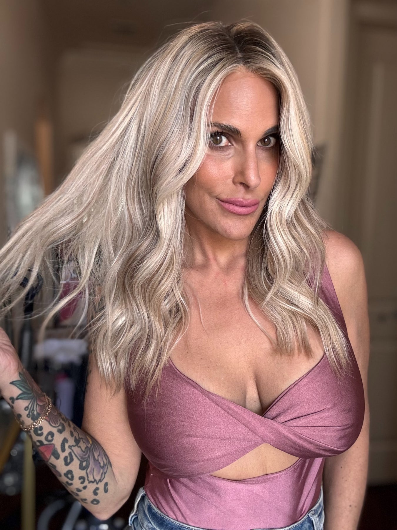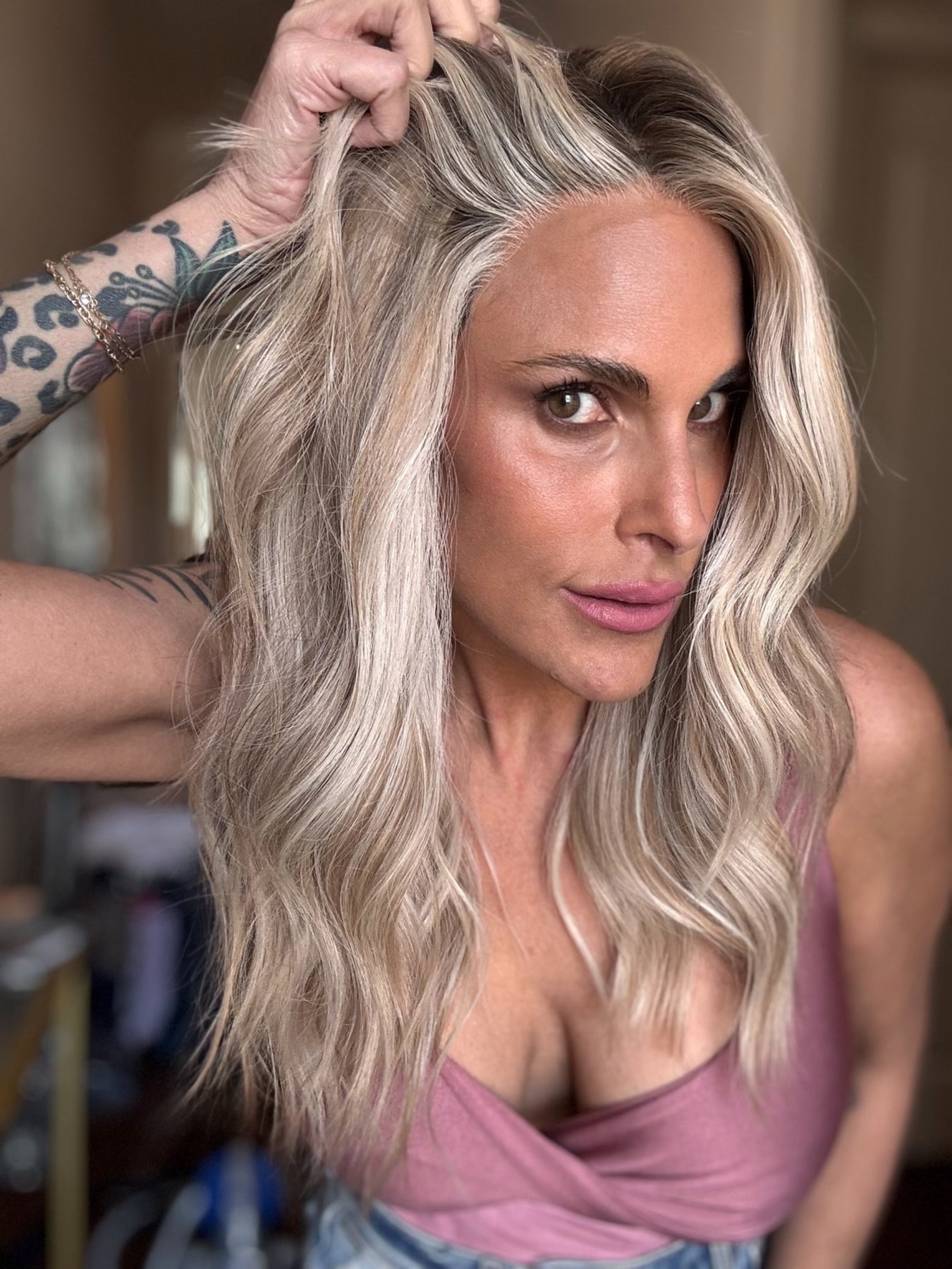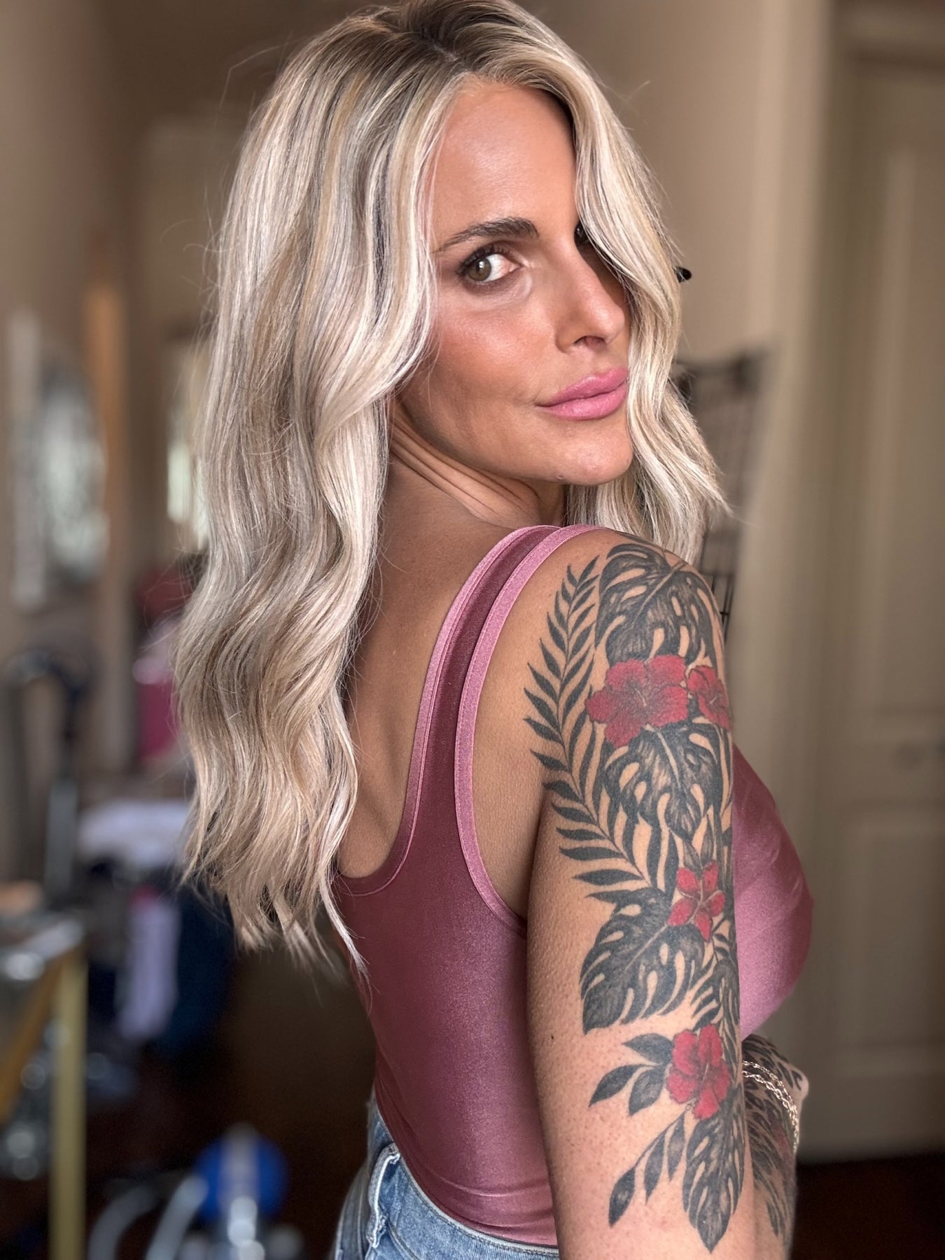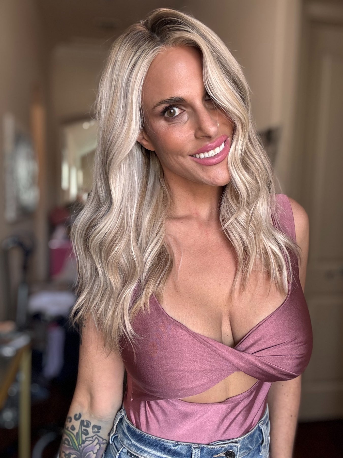 Color: brightest creamy blonde highlights with a medium blonde root smudge and soft caramel lowlights (warm and cool tones)