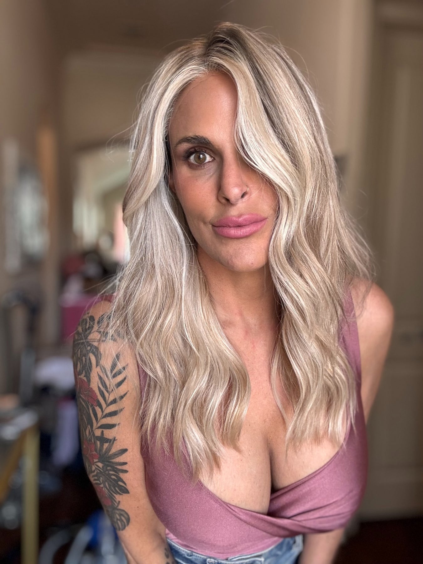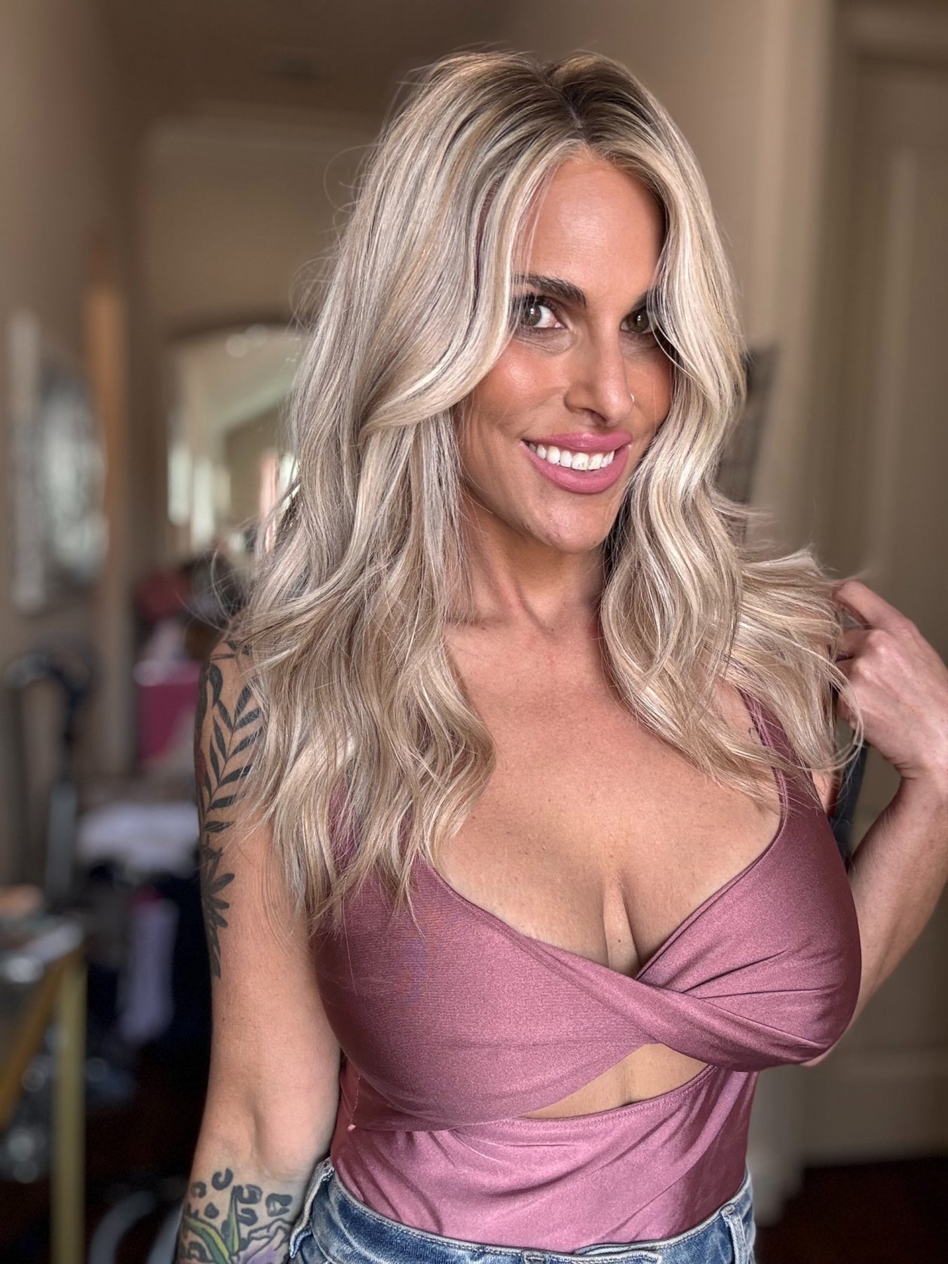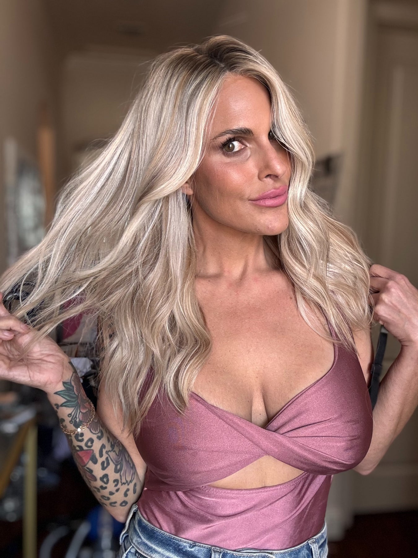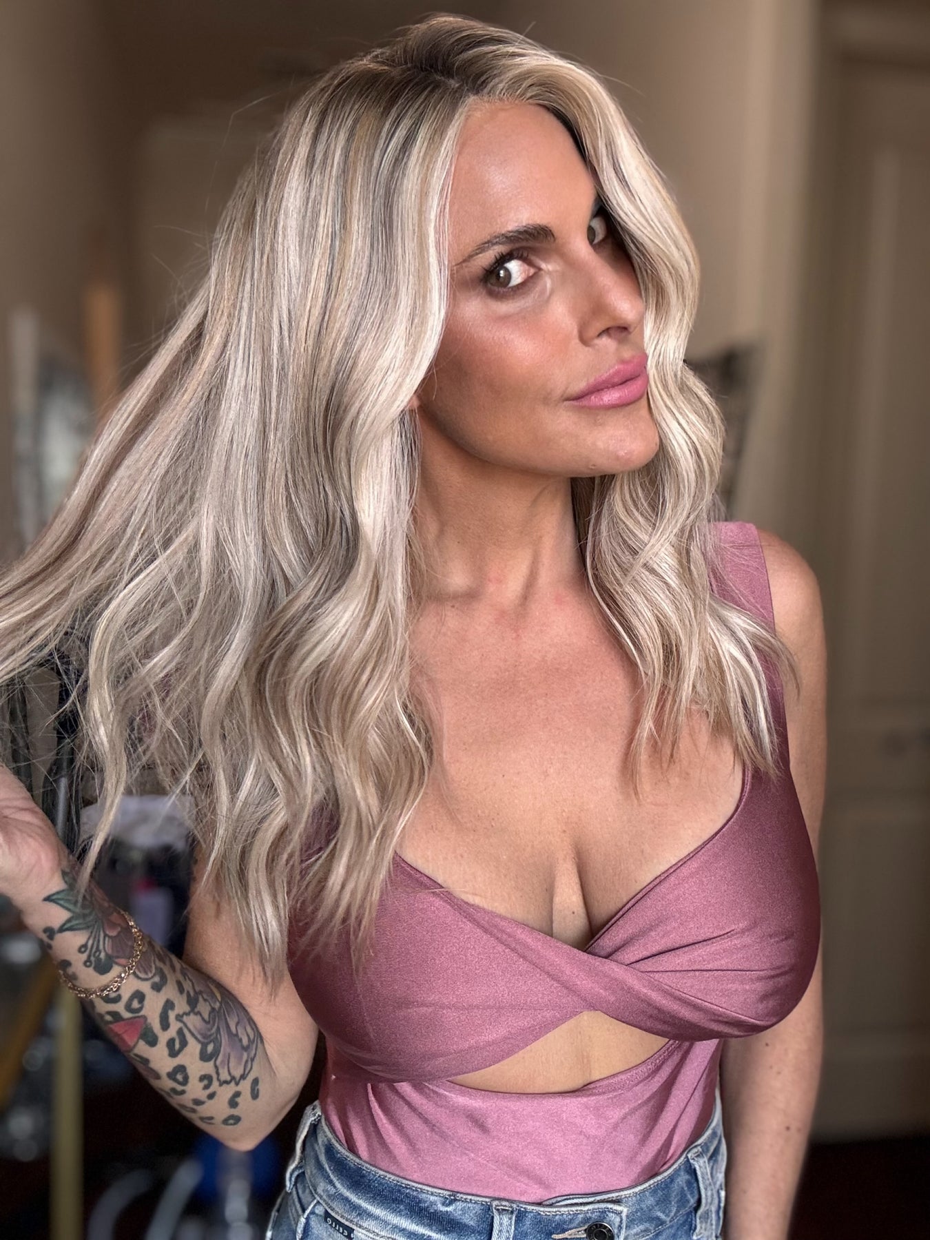 Color: brightest creamy blonde highlights with a medium blonde root smudge and soft caramel lowlights (warm and cool tones)