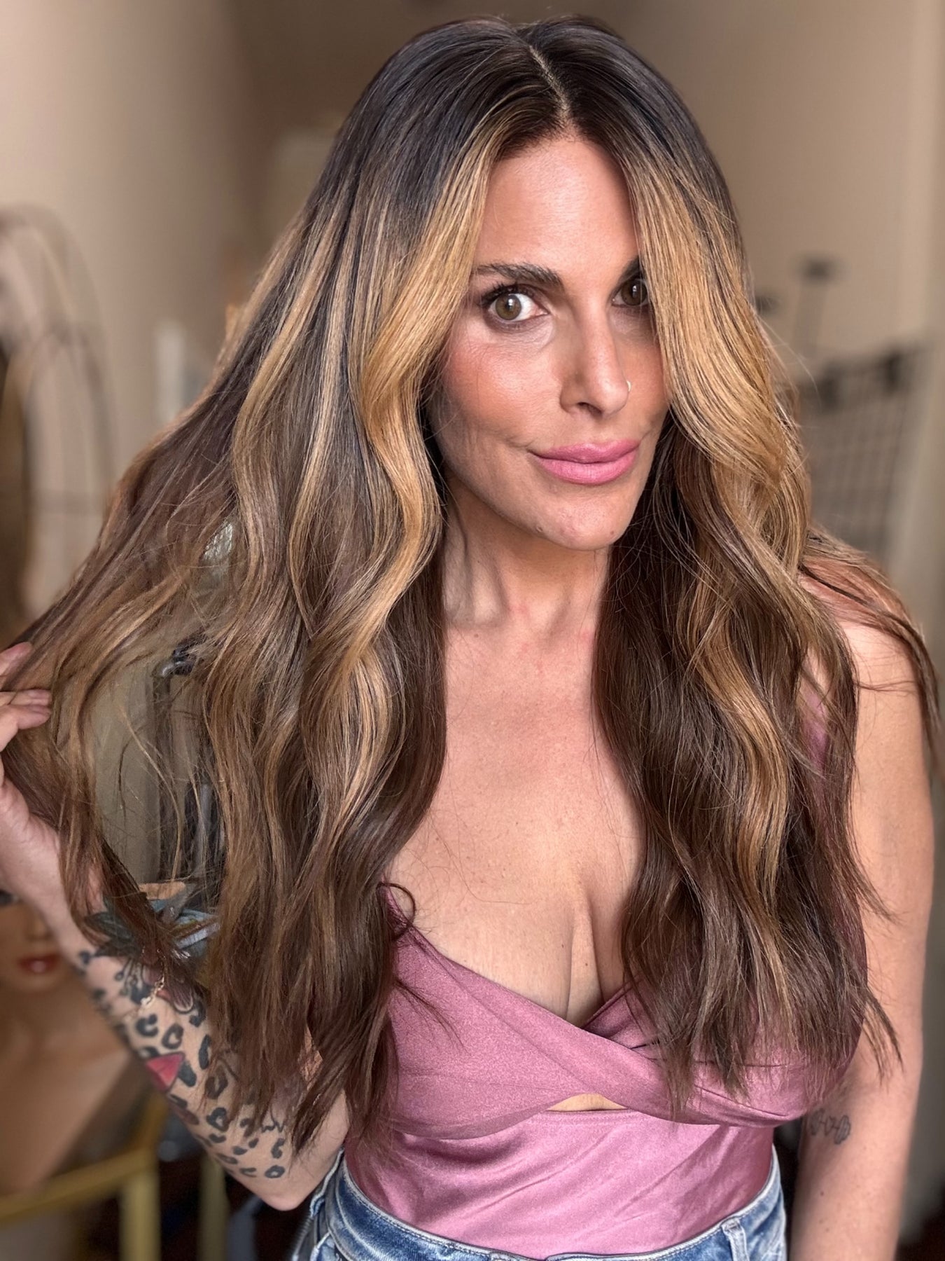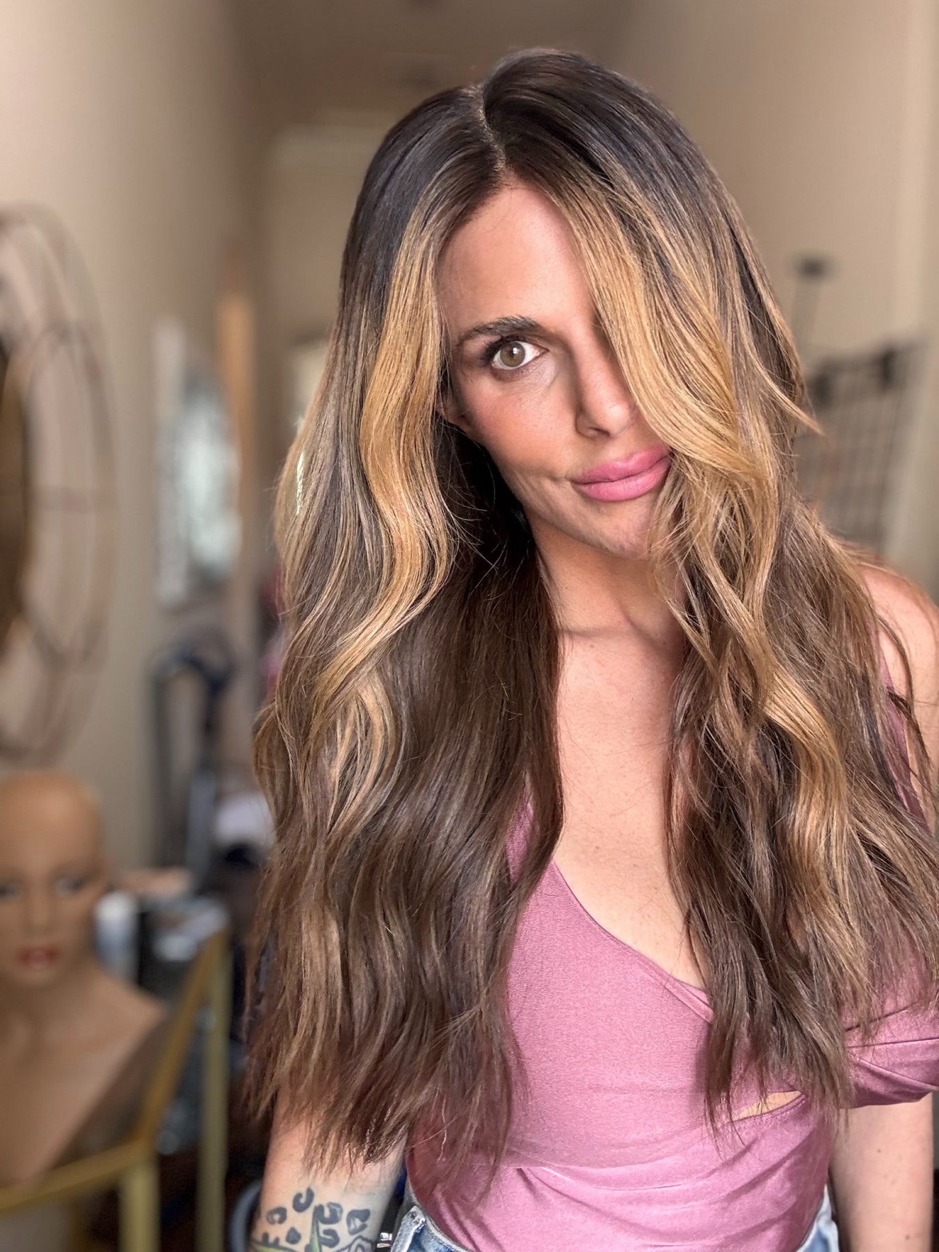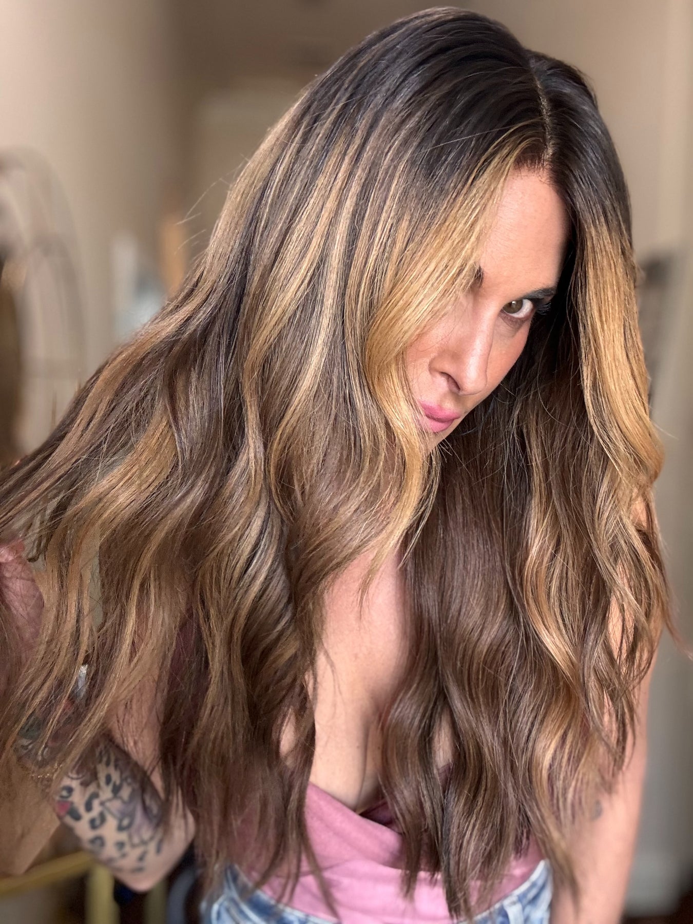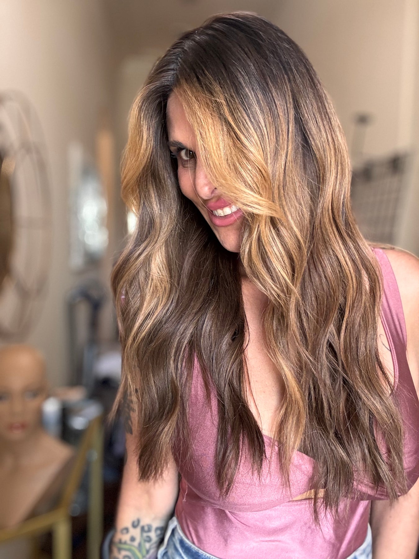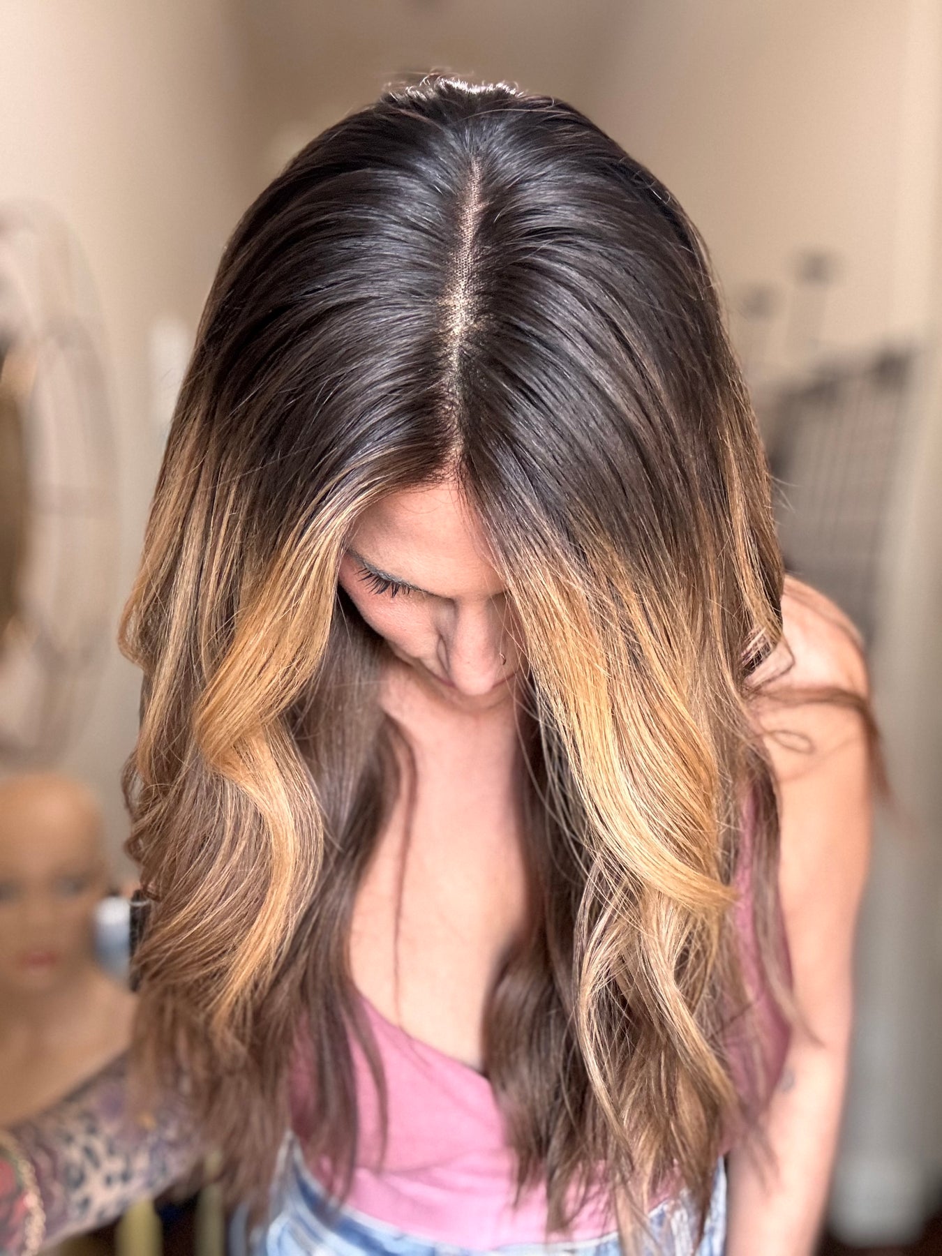 Color: dark brown roots with warm golden/coppery bold highlights (very dimensional)