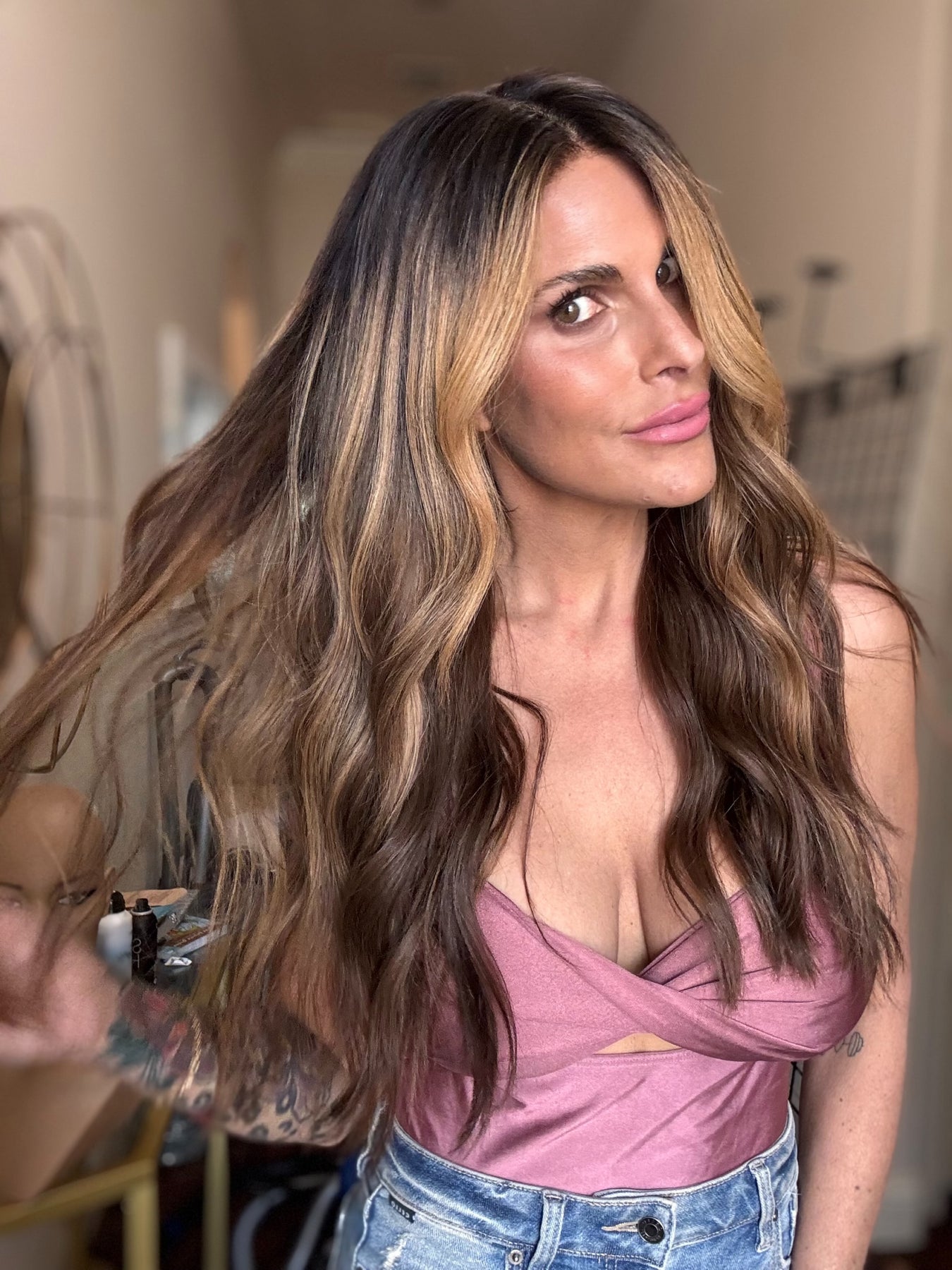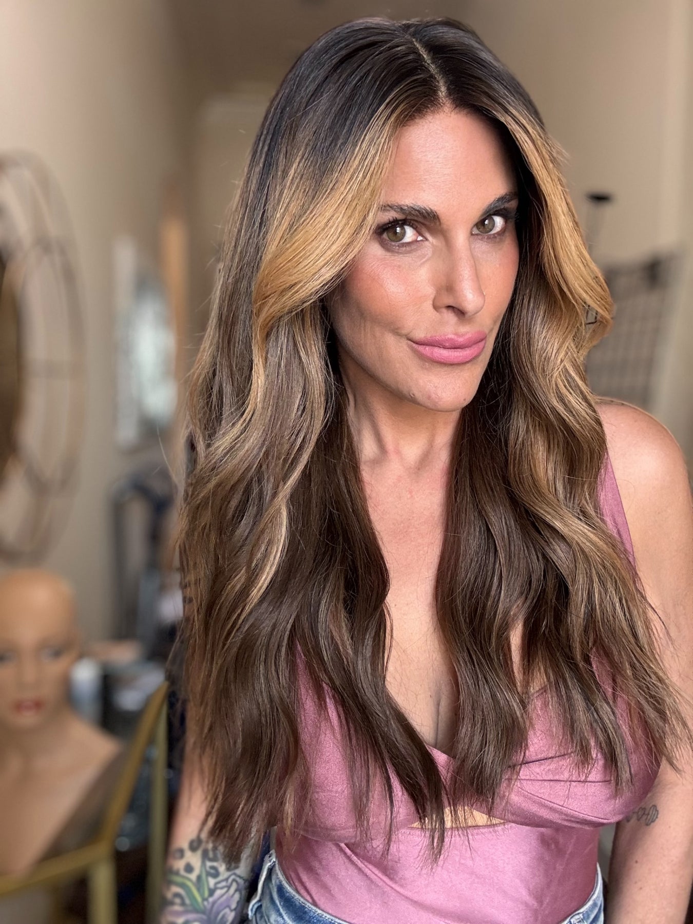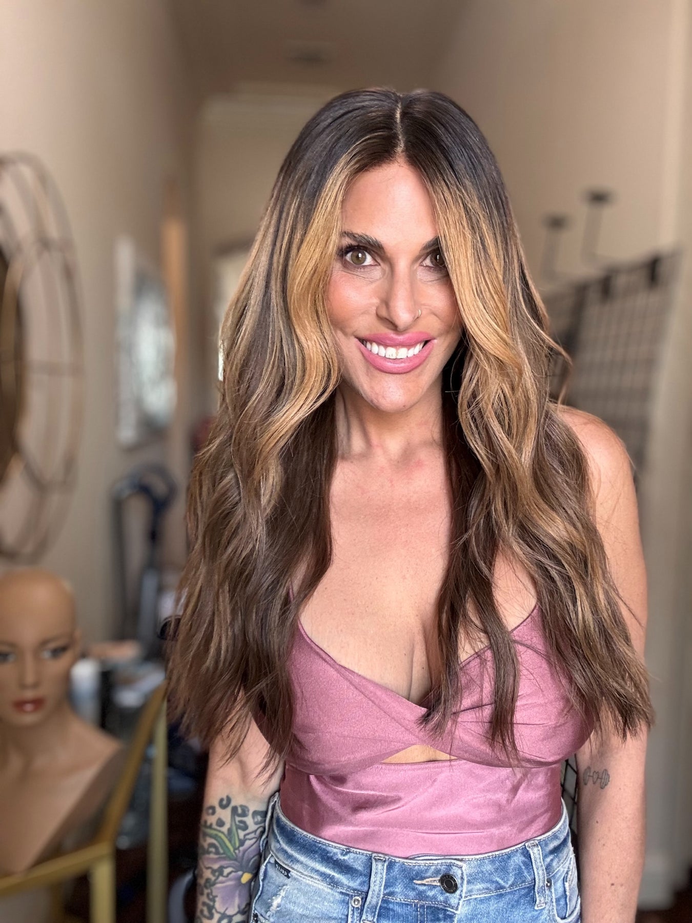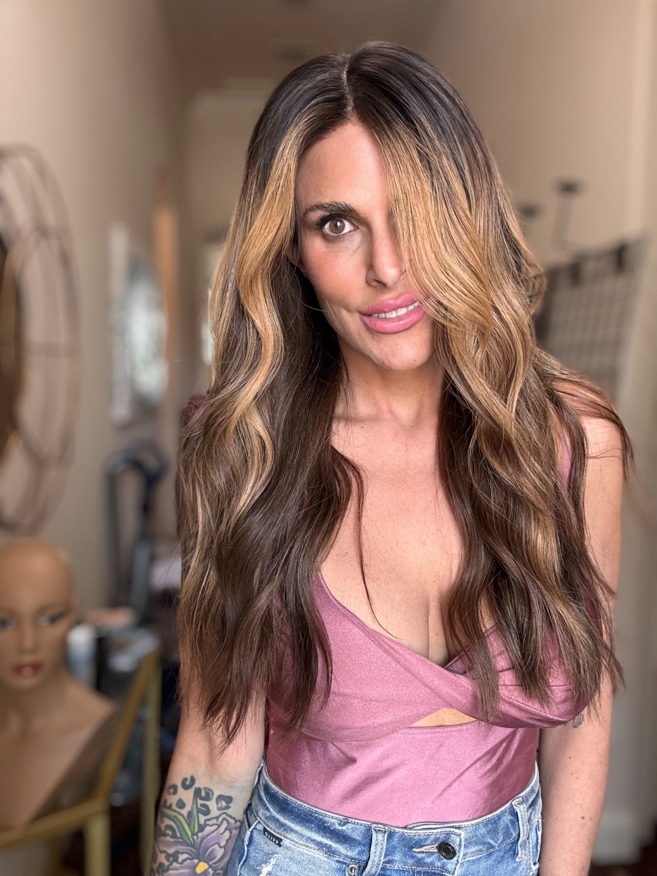 Color: dark brown roots with warm golden/coppery bold highlights (very dimensional)