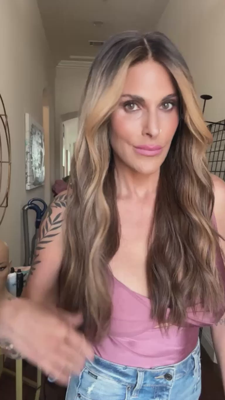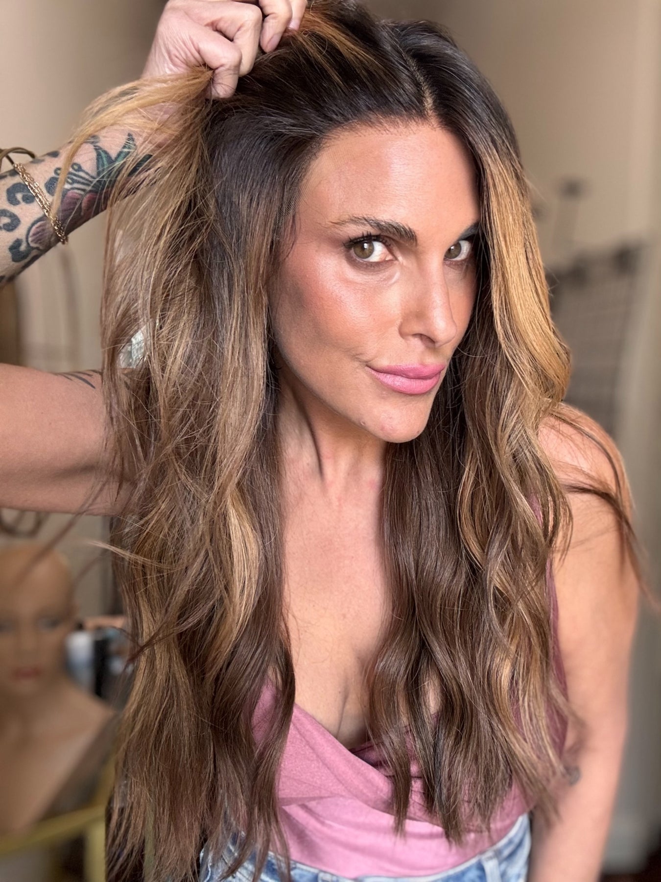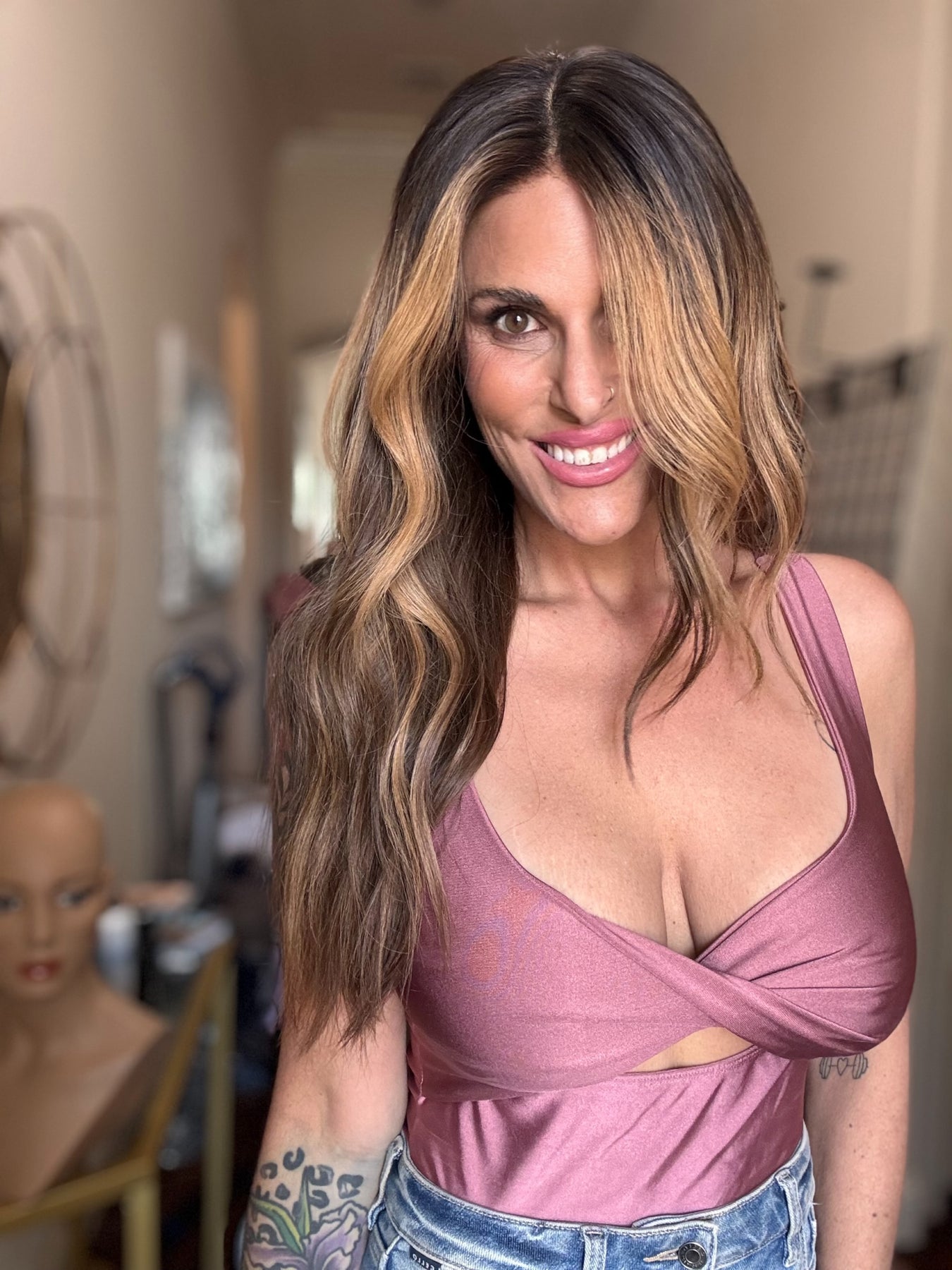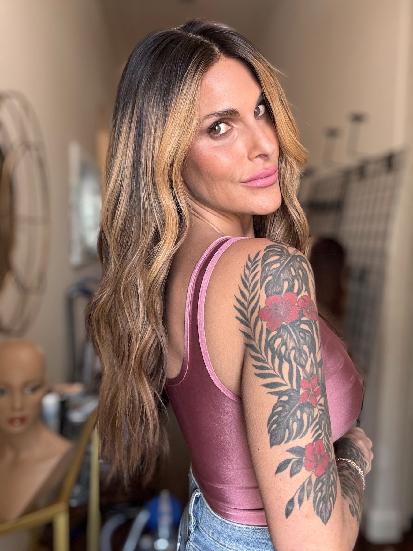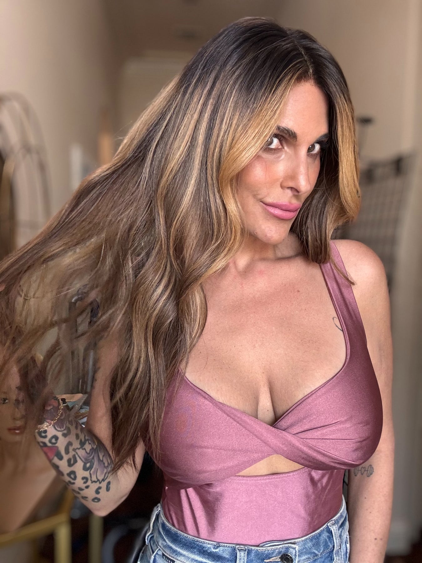 Color: dark brown roots with warm golden/coppery bold highlights (very dimensional)