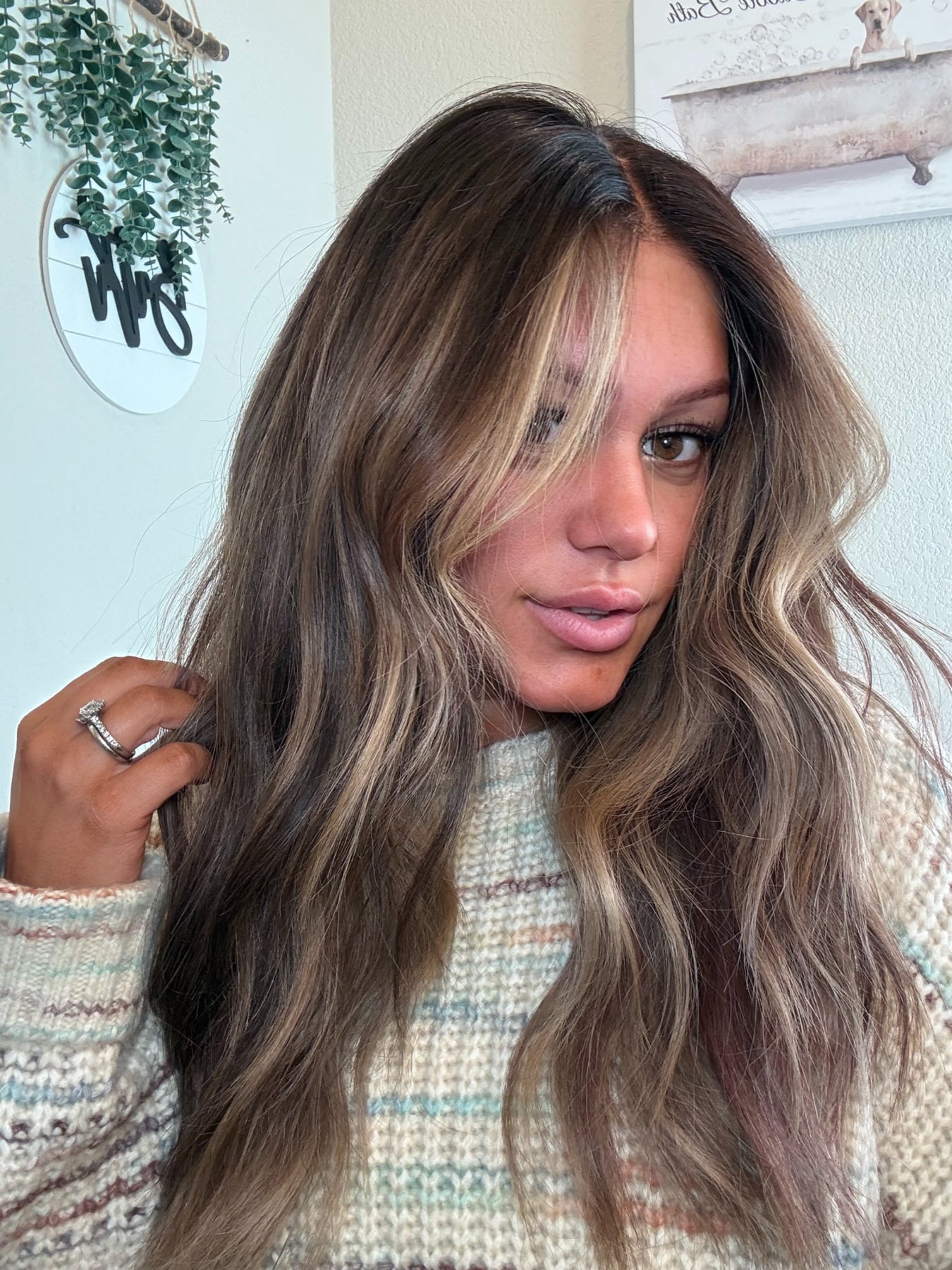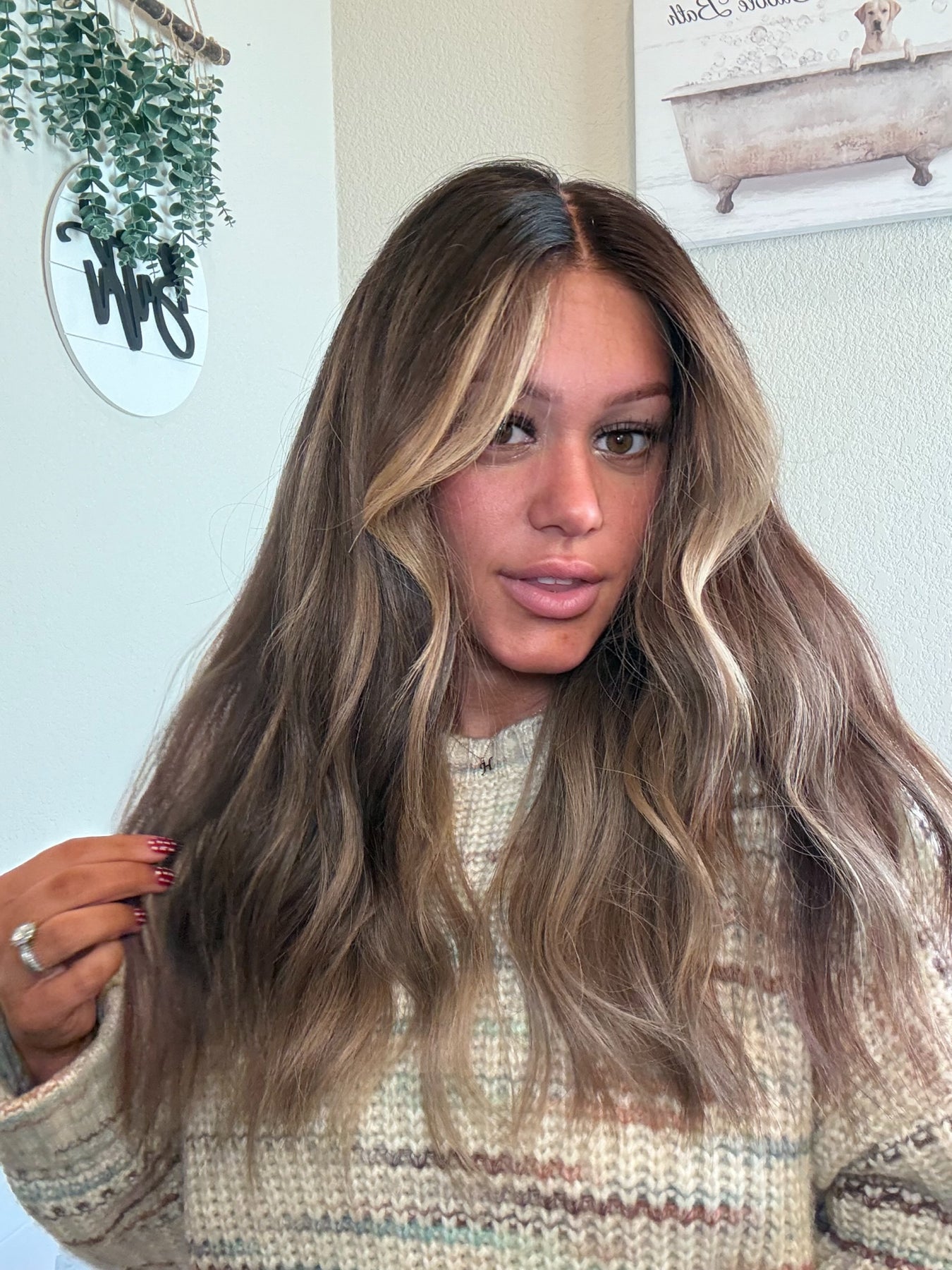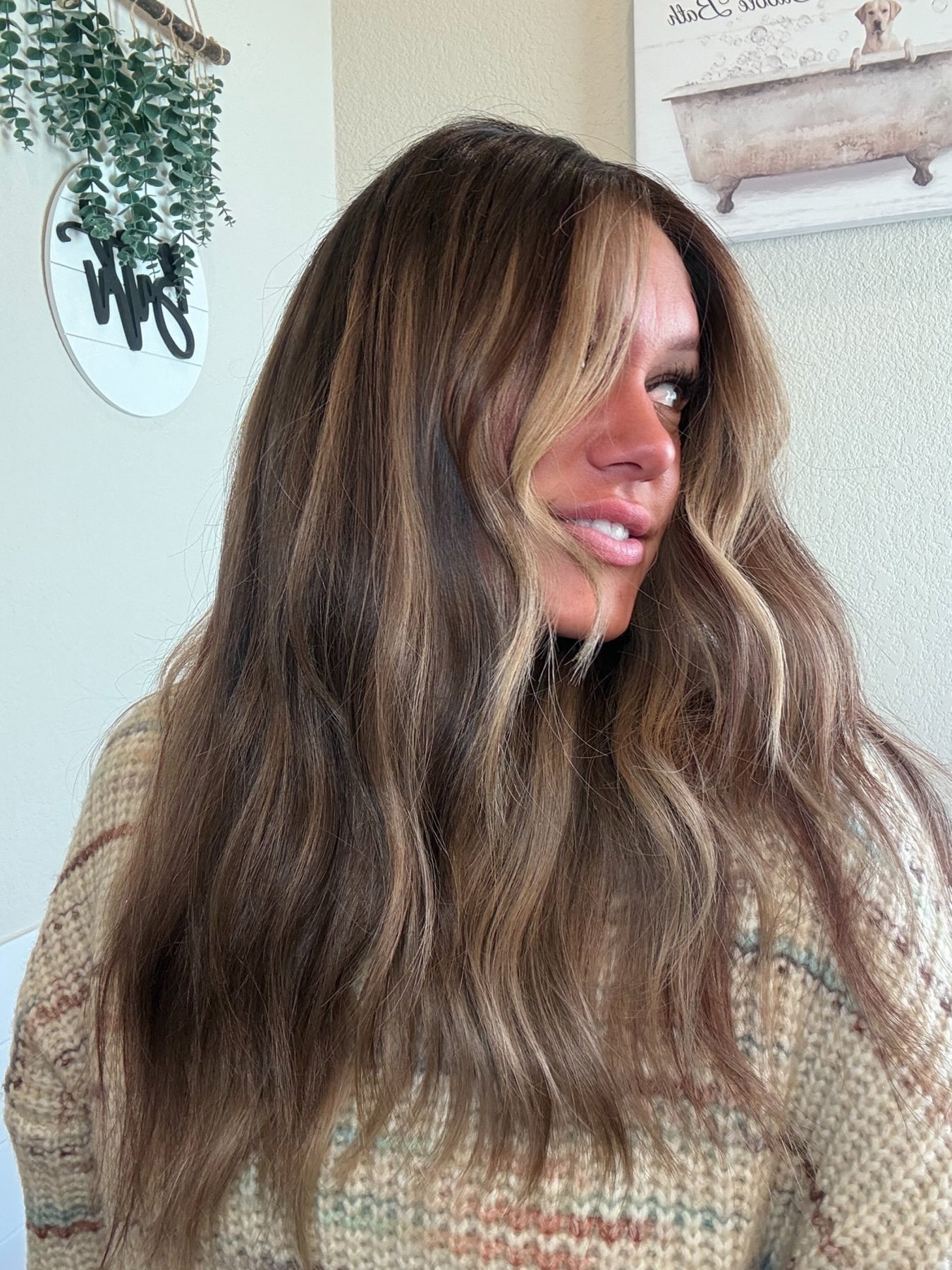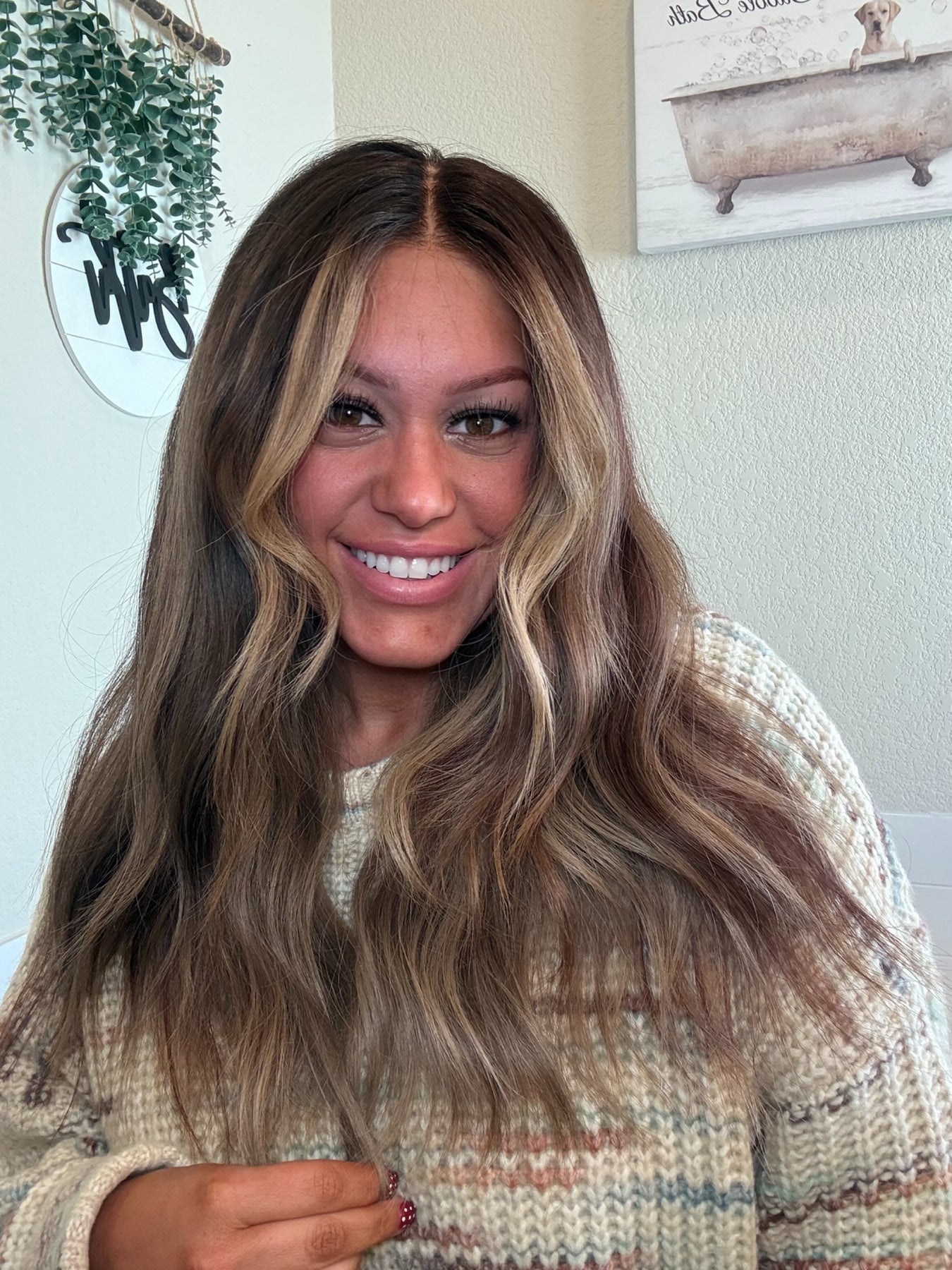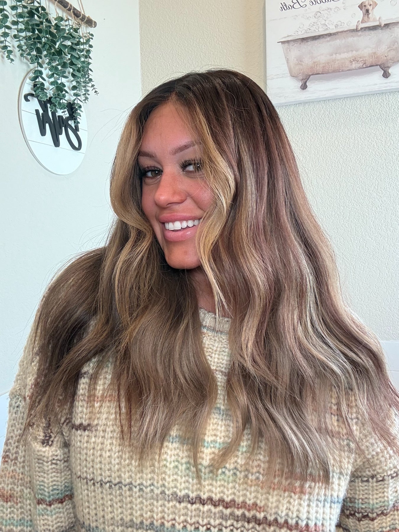 Color: A medium brown base Fading into a golden blonde balayage with rich caramel, low lights and Subtle copper hue