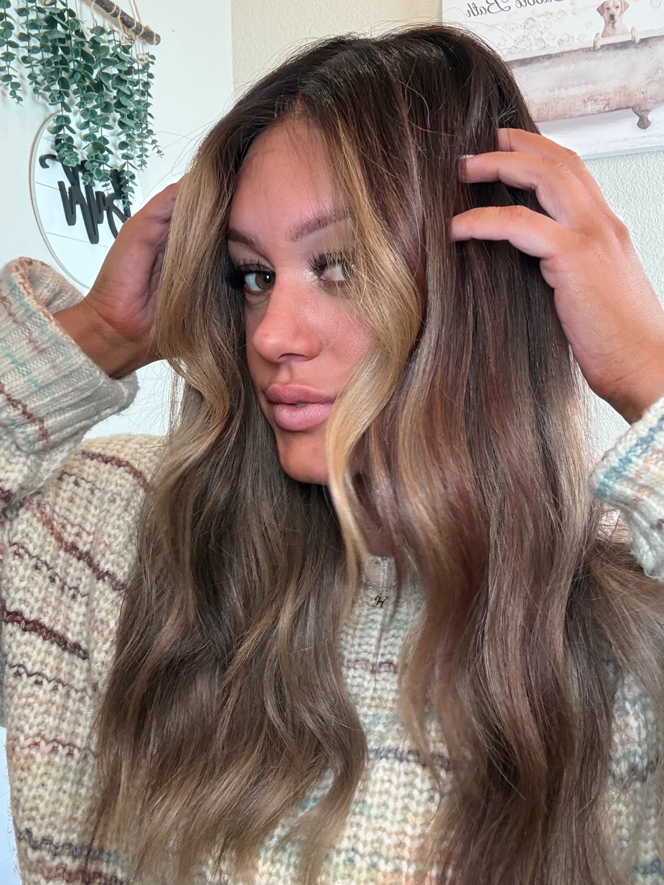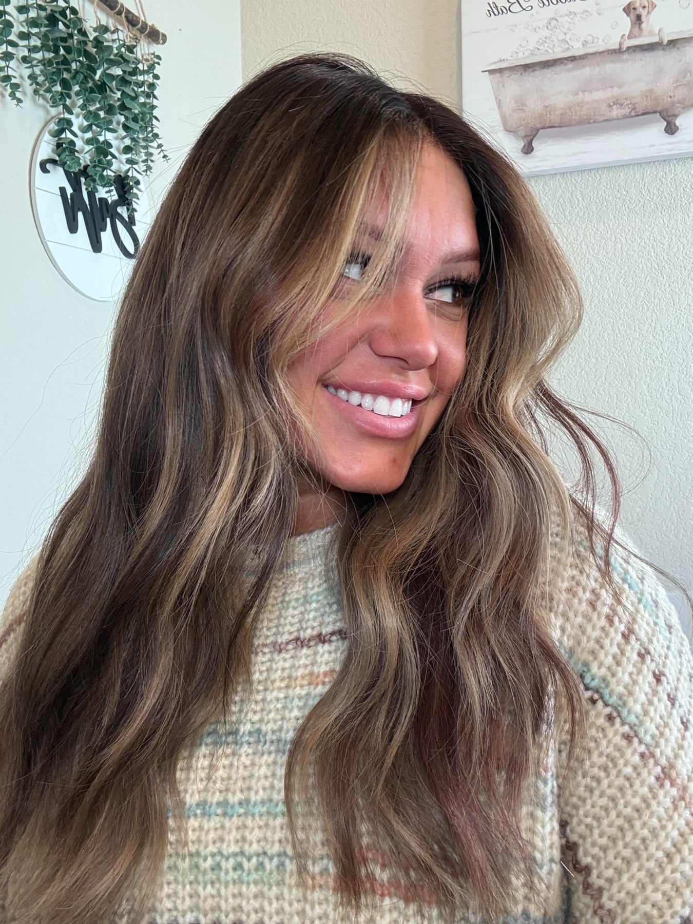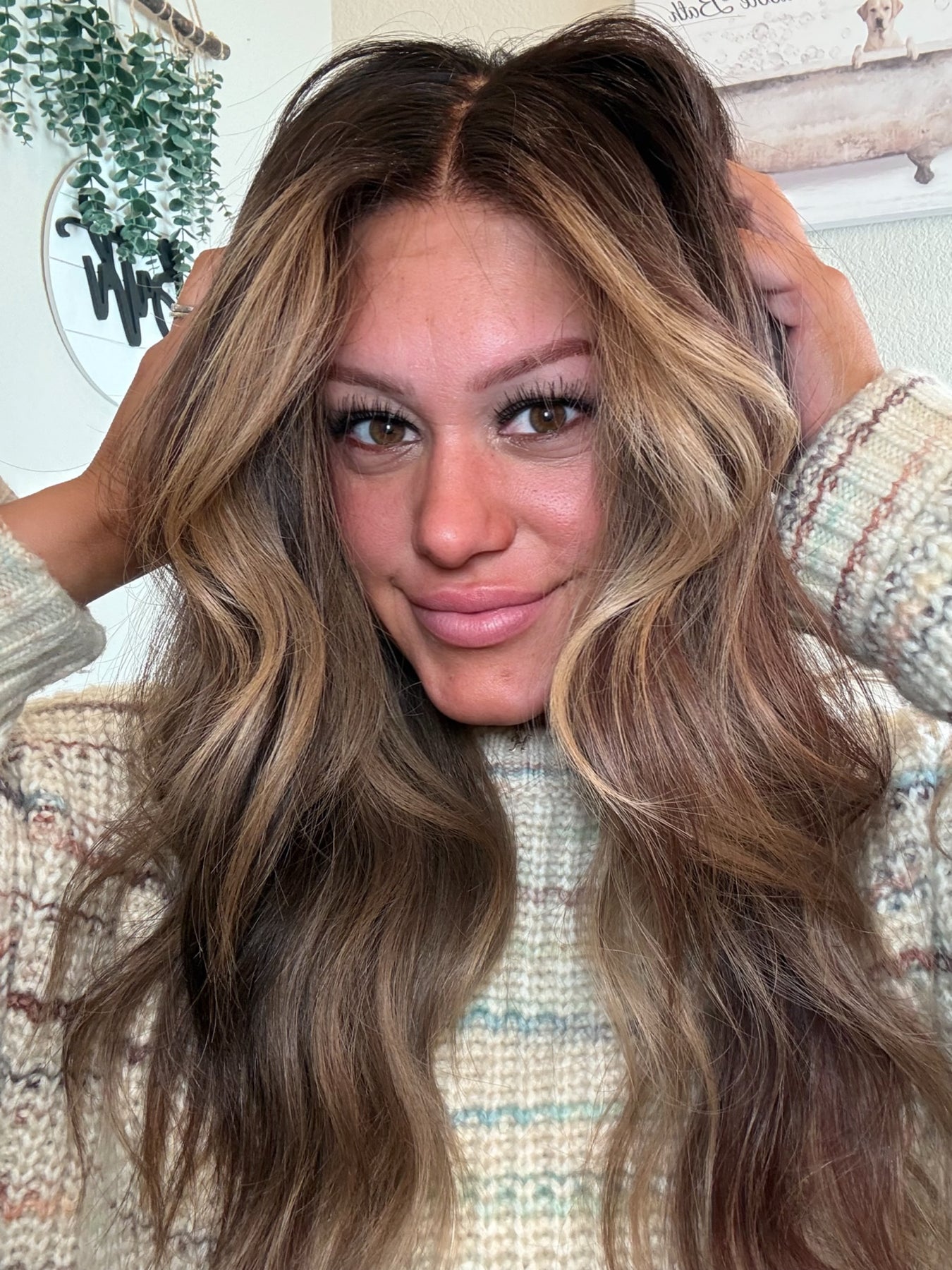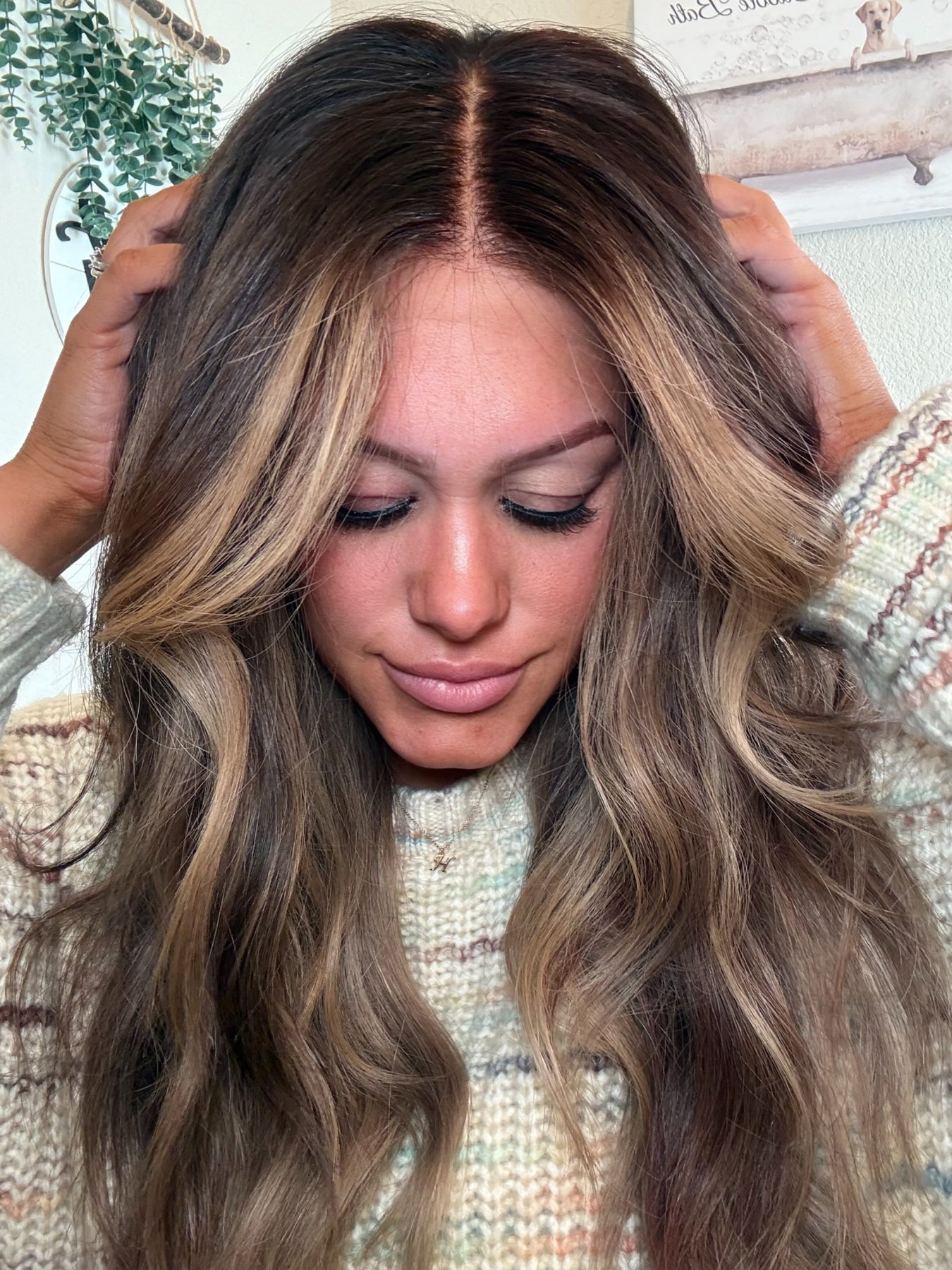 Color: A medium brown base Fading into a golden blonde balayage with rich caramel, low lights and Subtle copper hue
