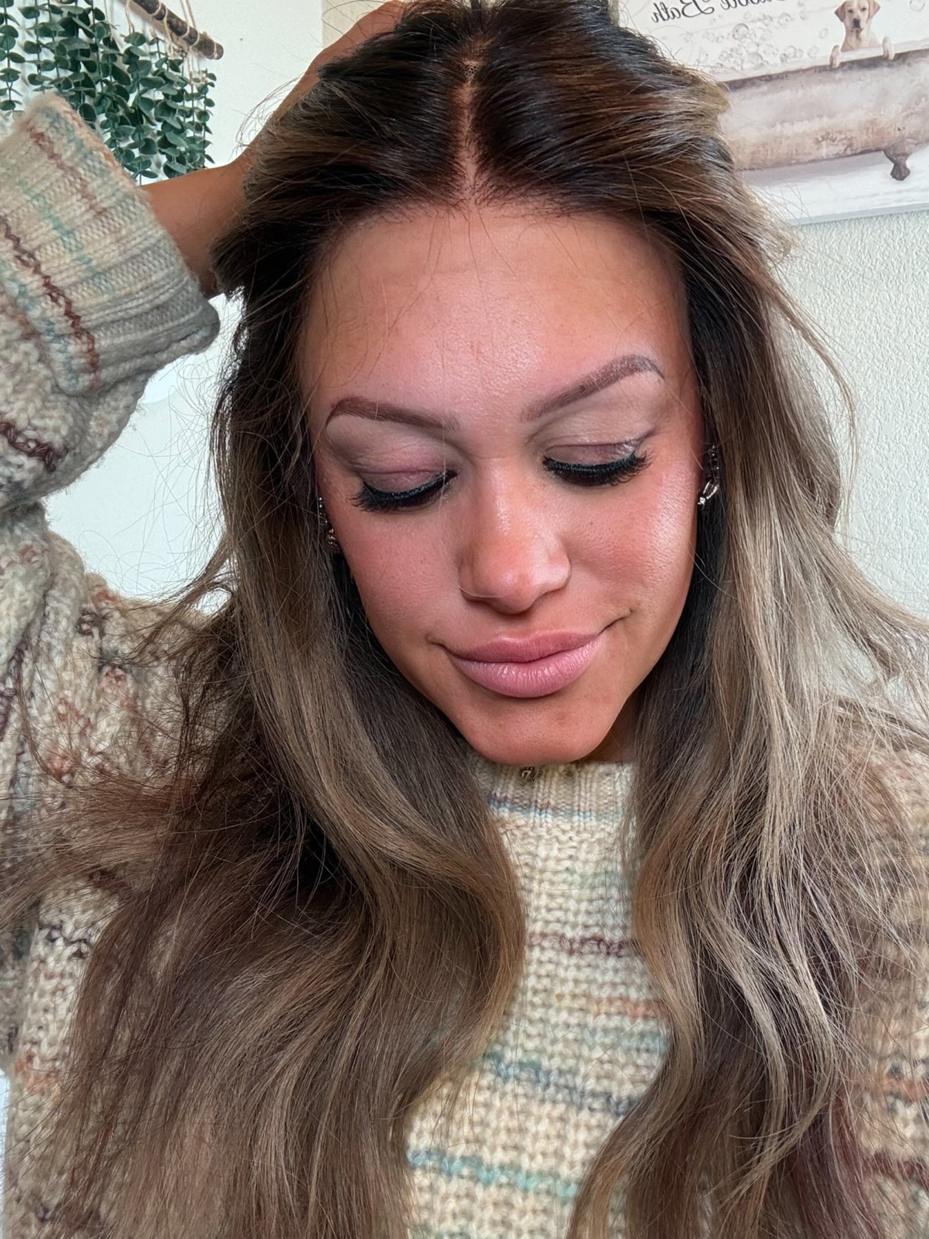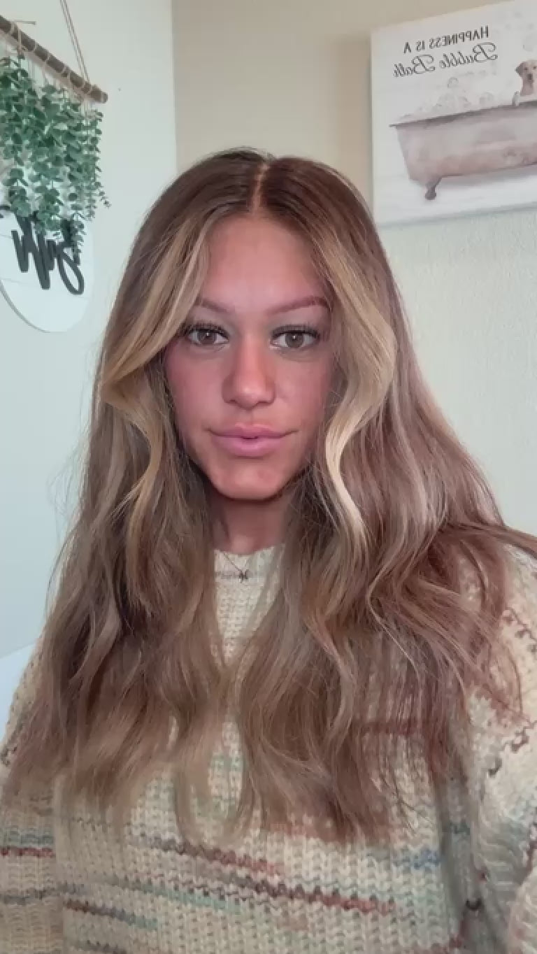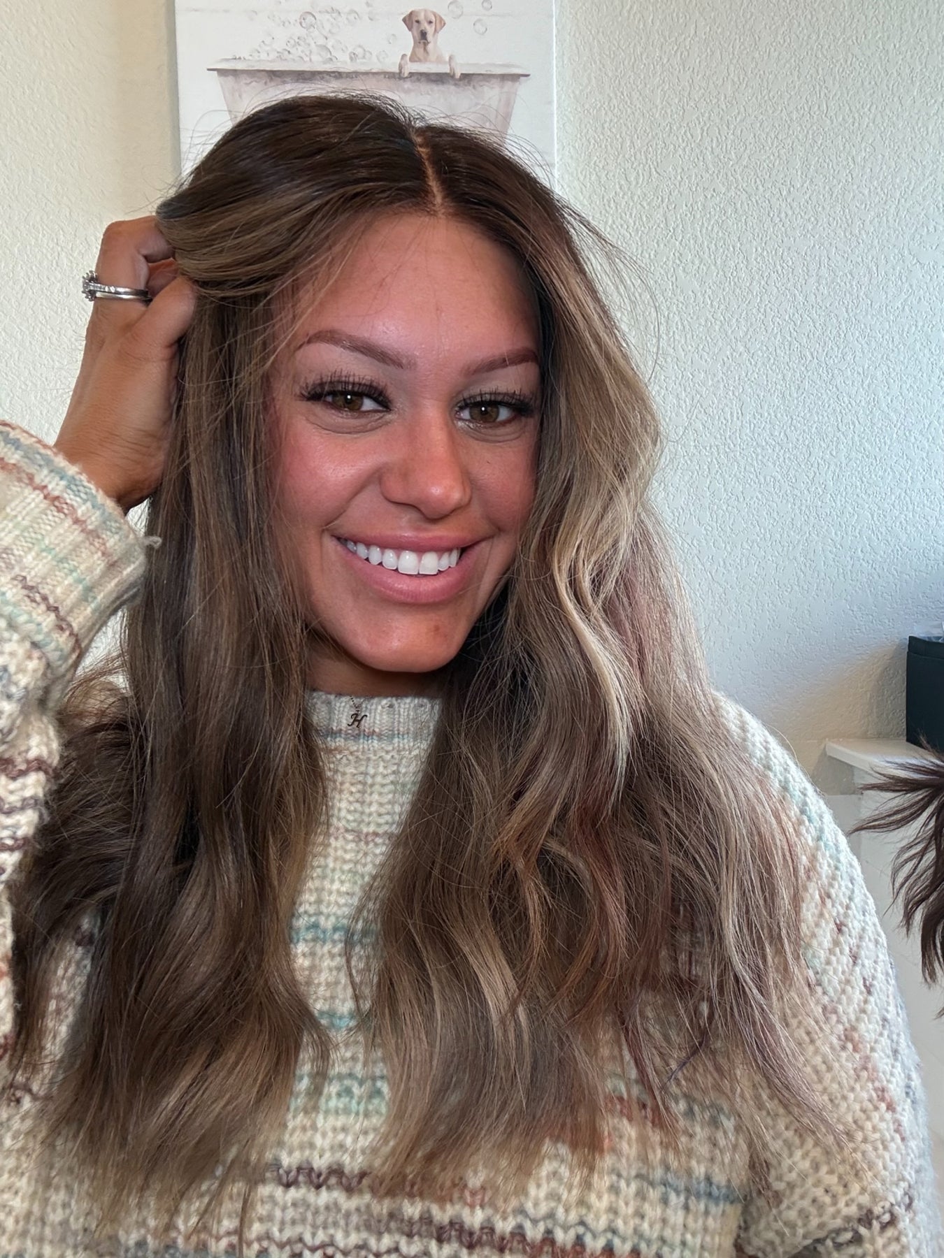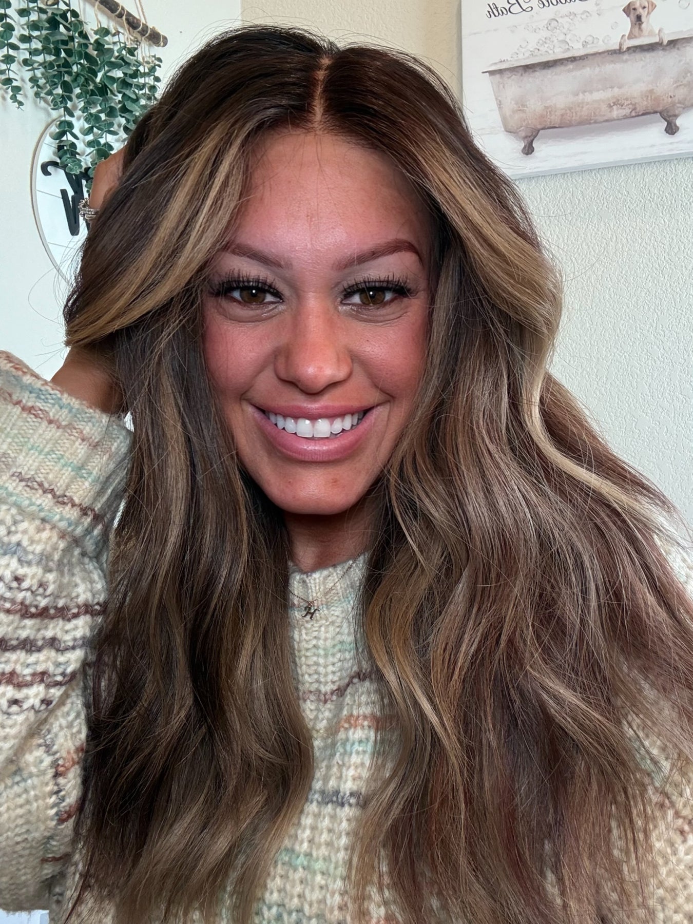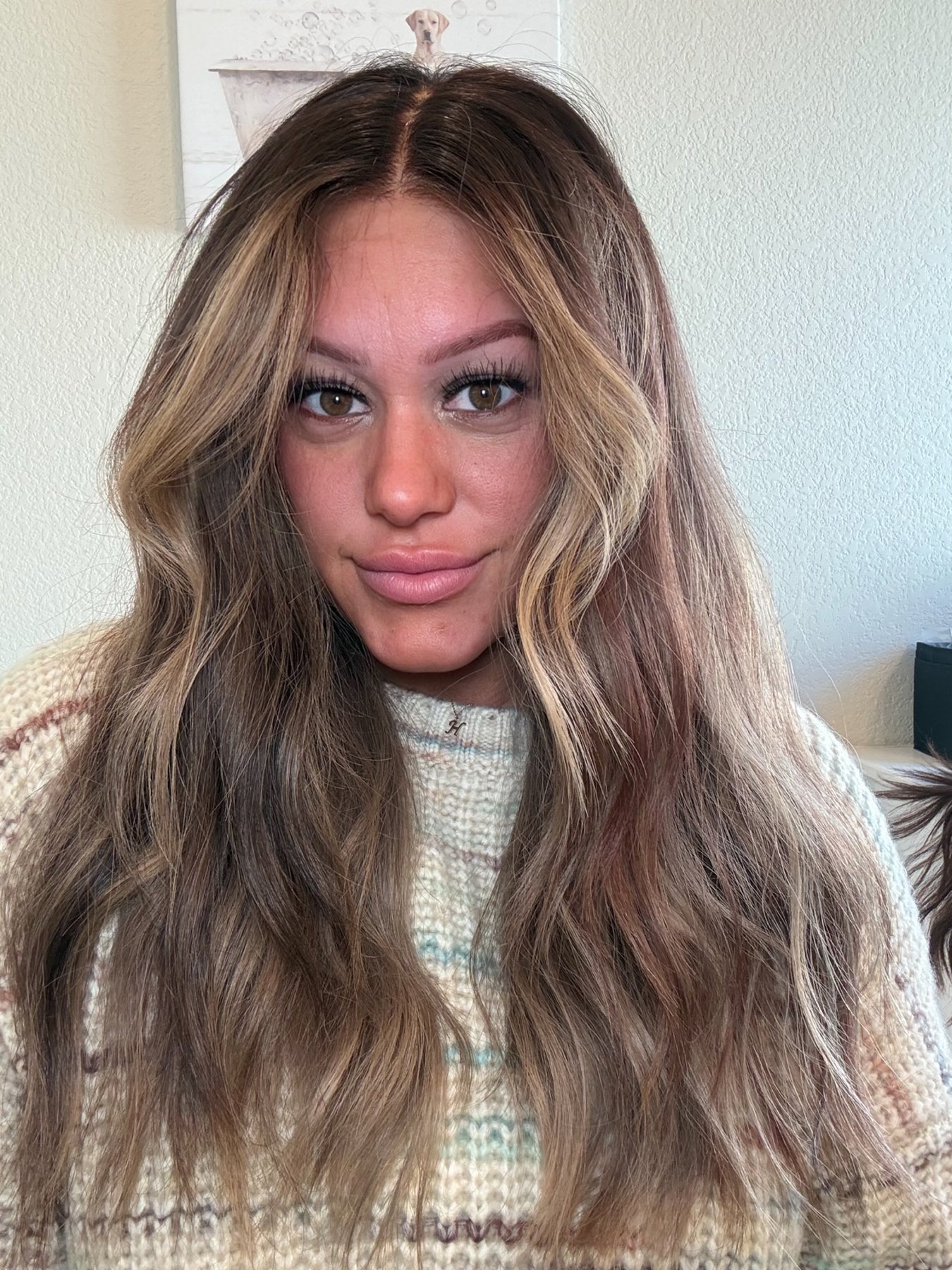Color: A medium brown base Fading into a golden blonde balayage with rich caramel, low lights and Subtle copper hue