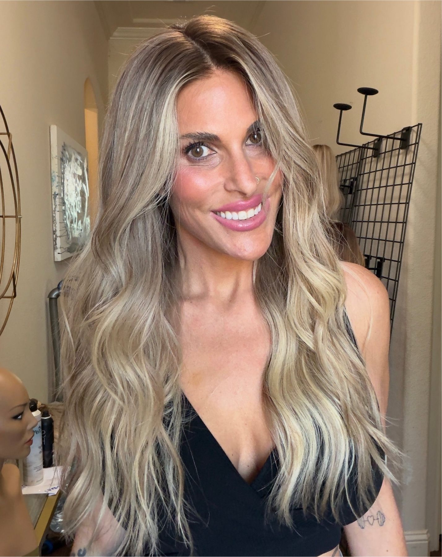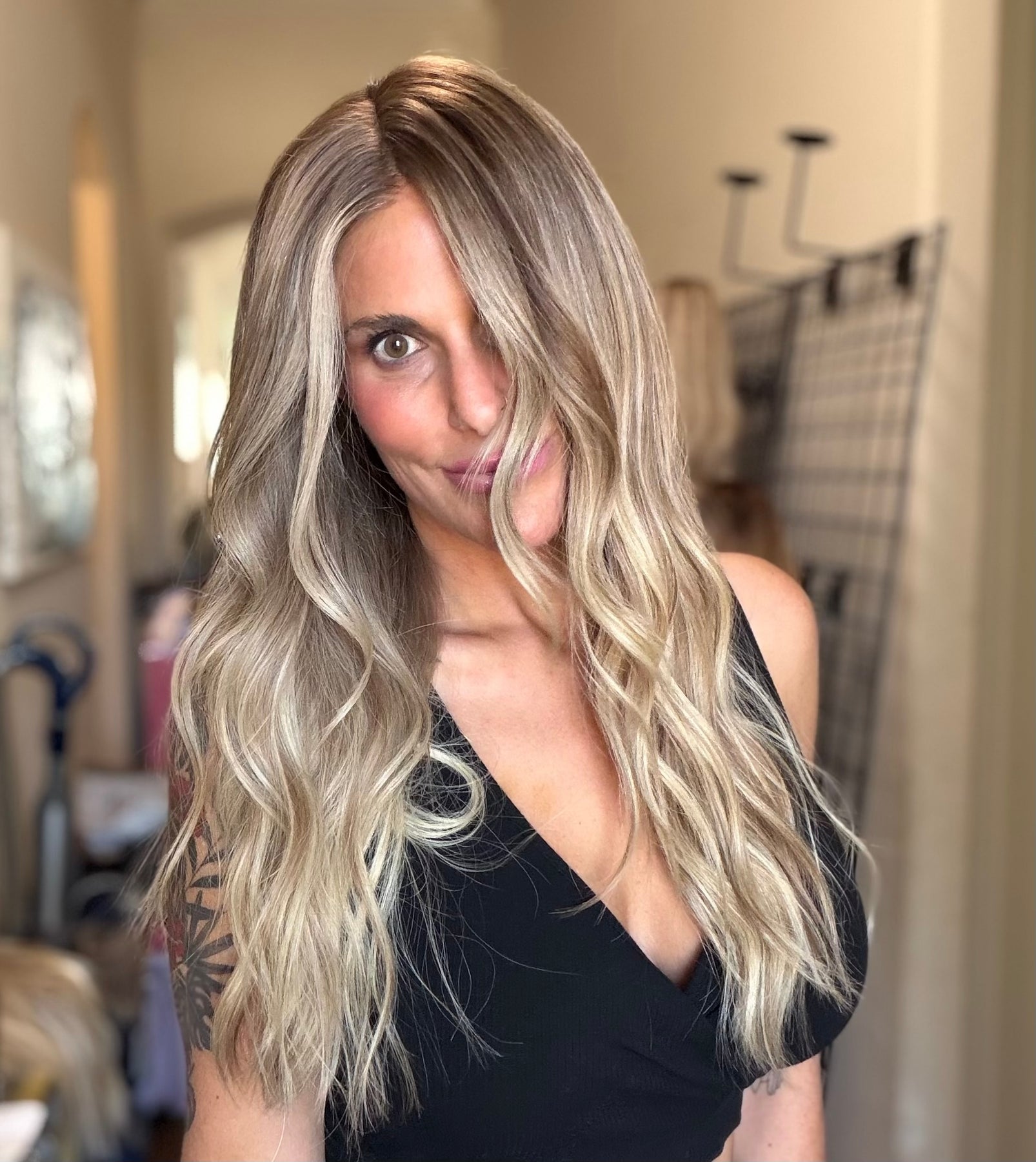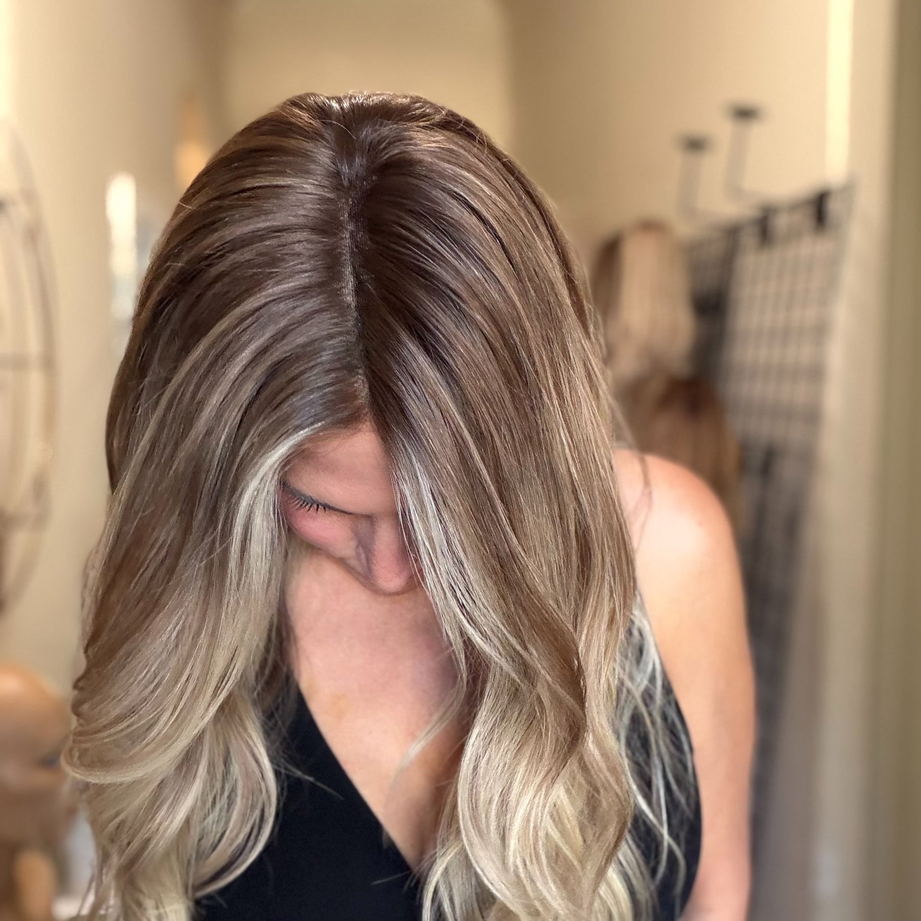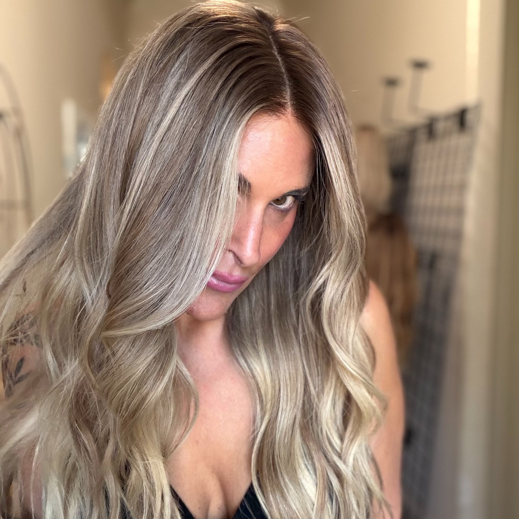 Color: dark ash gold blonde roots and lowlights with creamy blondes