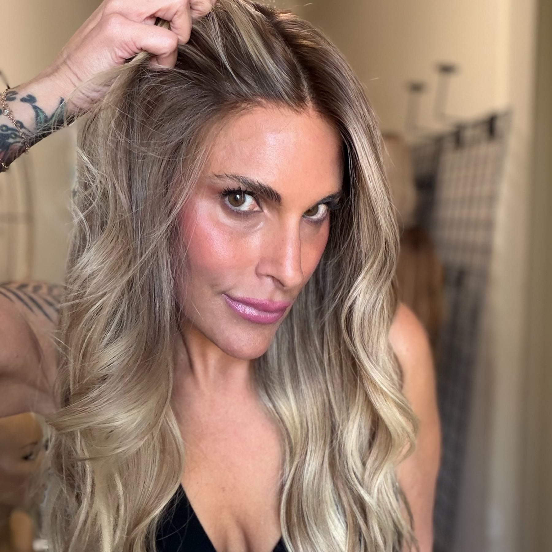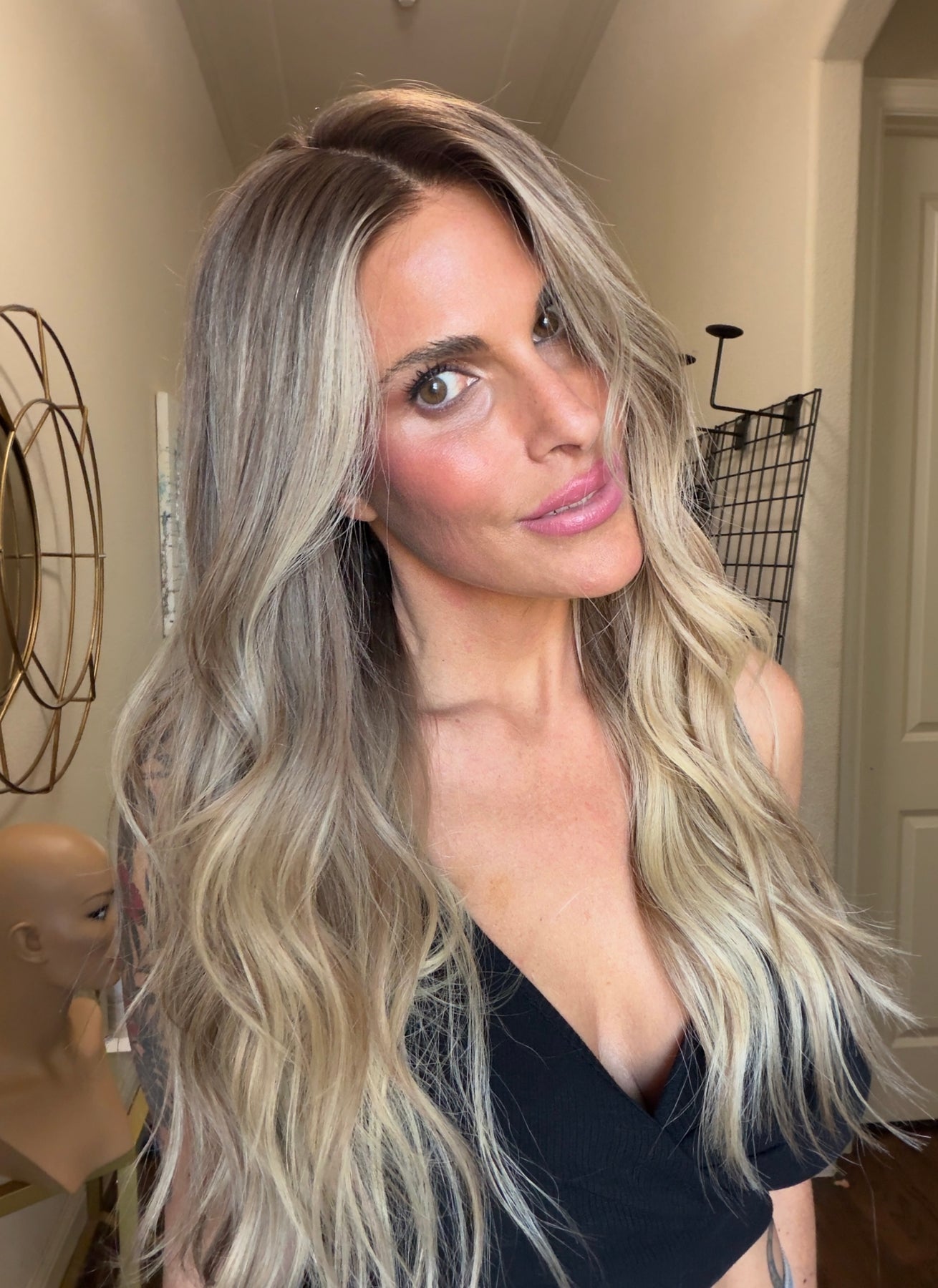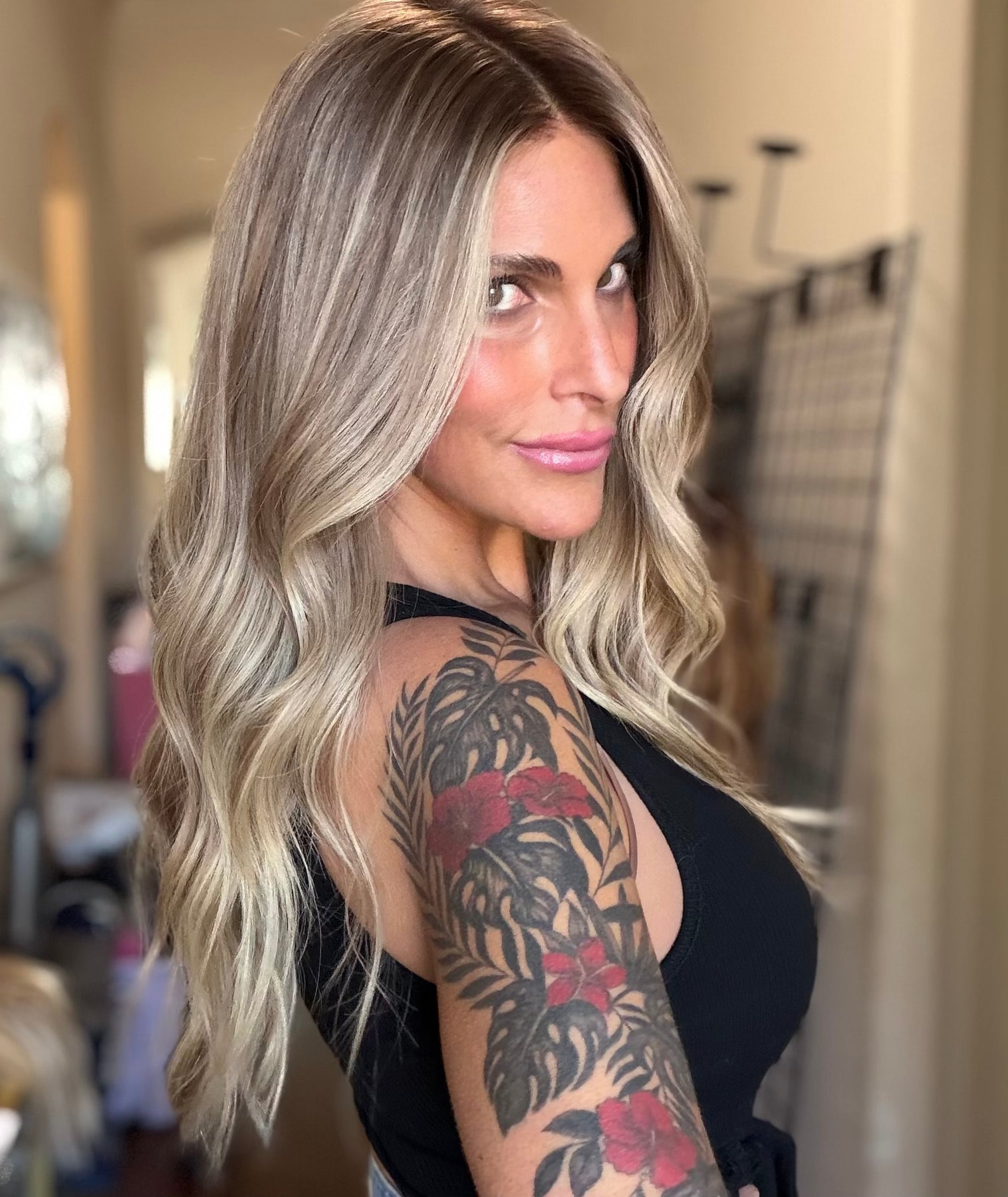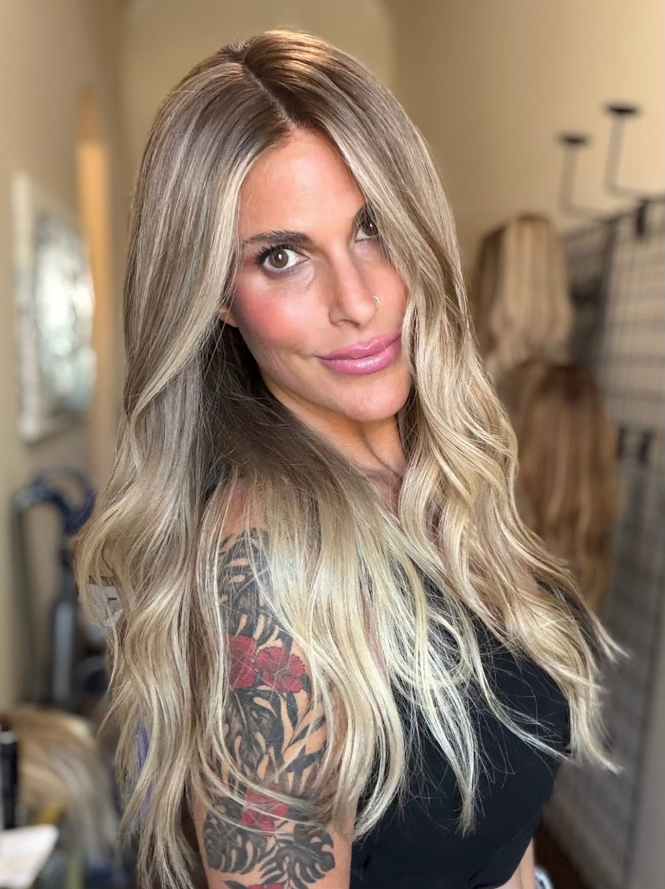 Color: dark ash gold blonde roots and lowlights with creamy blondes