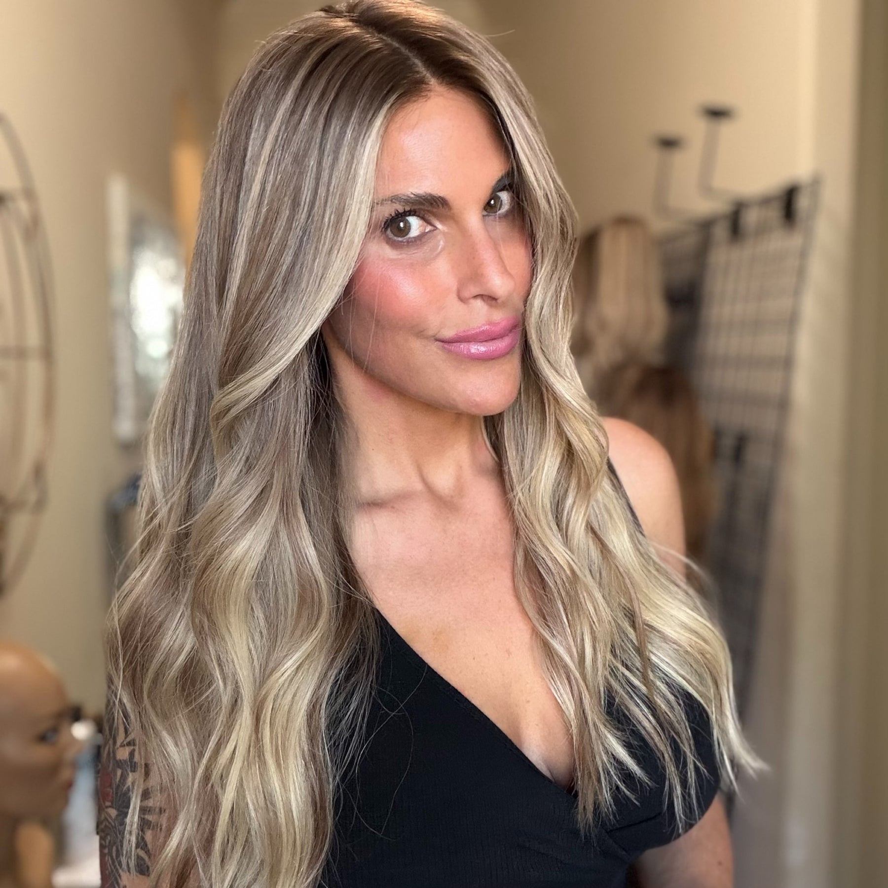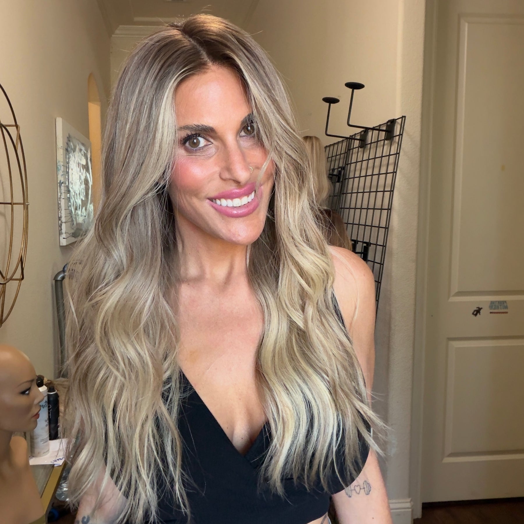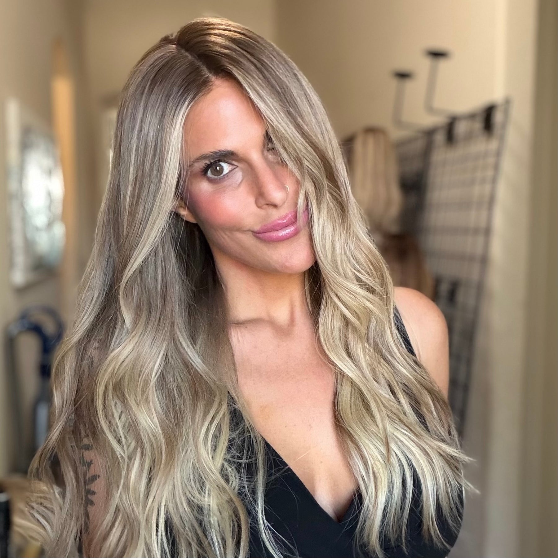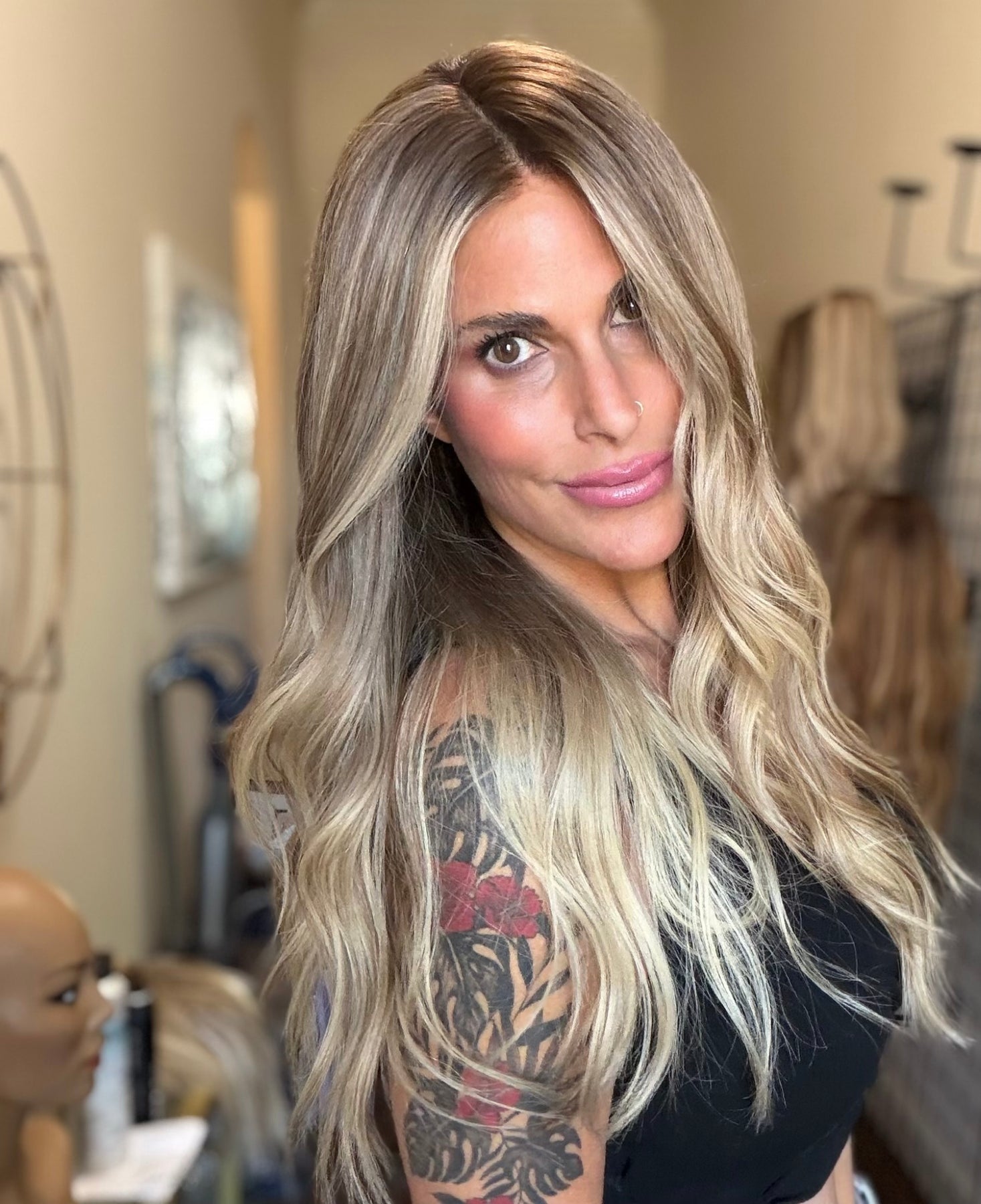 Color: dark ash gold blonde roots and lowlights with creamy blondes